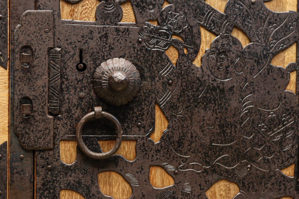 縁起の良い装飾金具に覆われたアイアンフレーム付き衣裳箪笥 BB3286