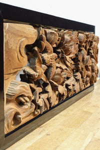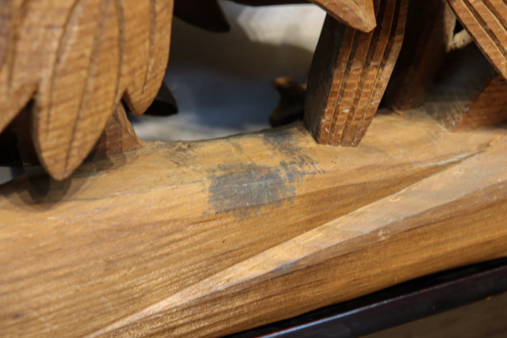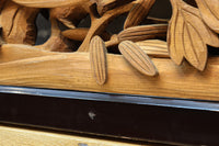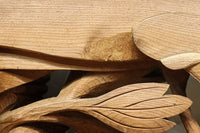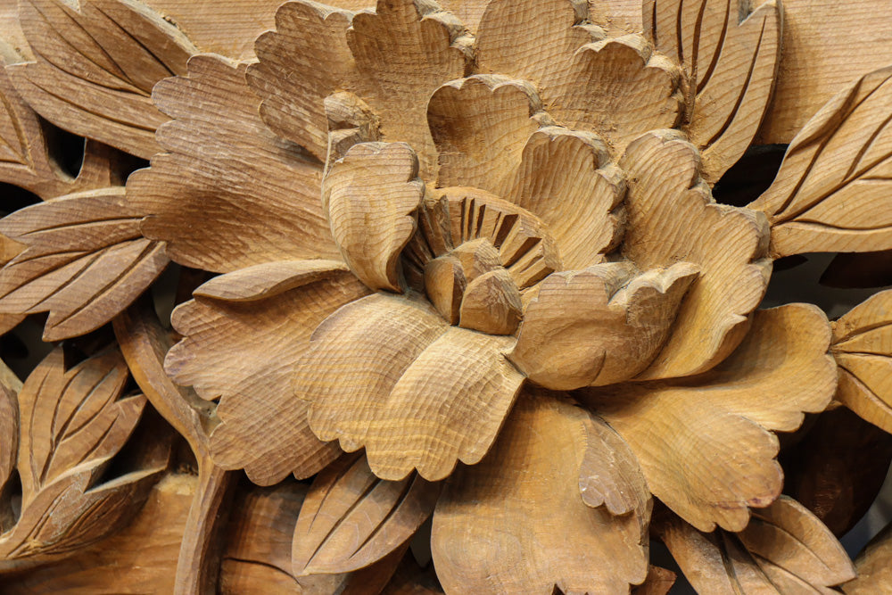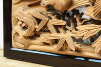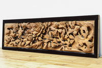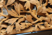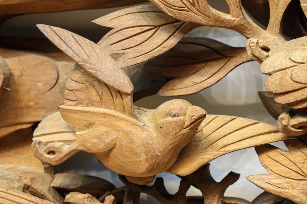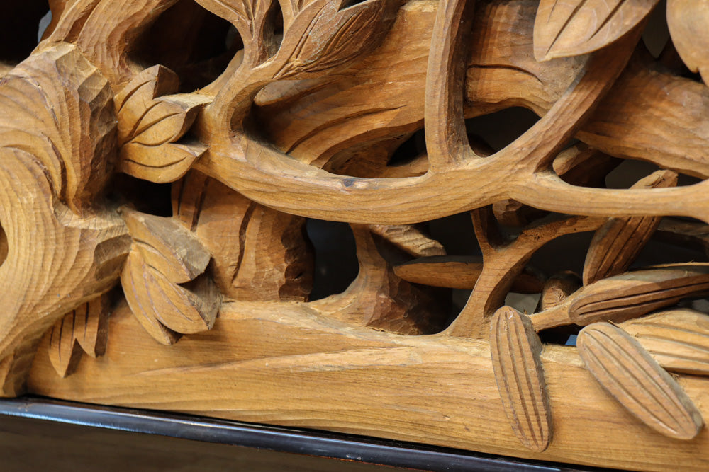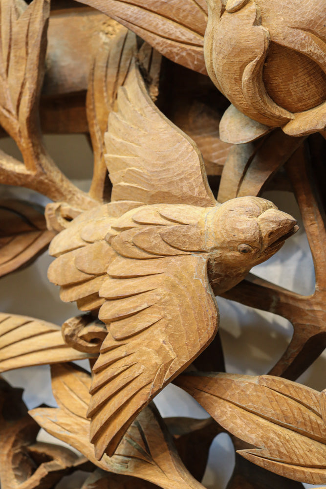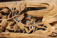 2羽の鳥と花や葉を細やかに重ねて彫り描いて