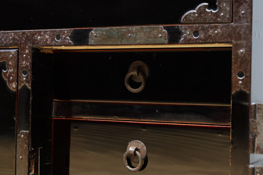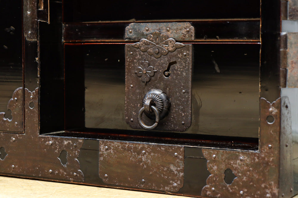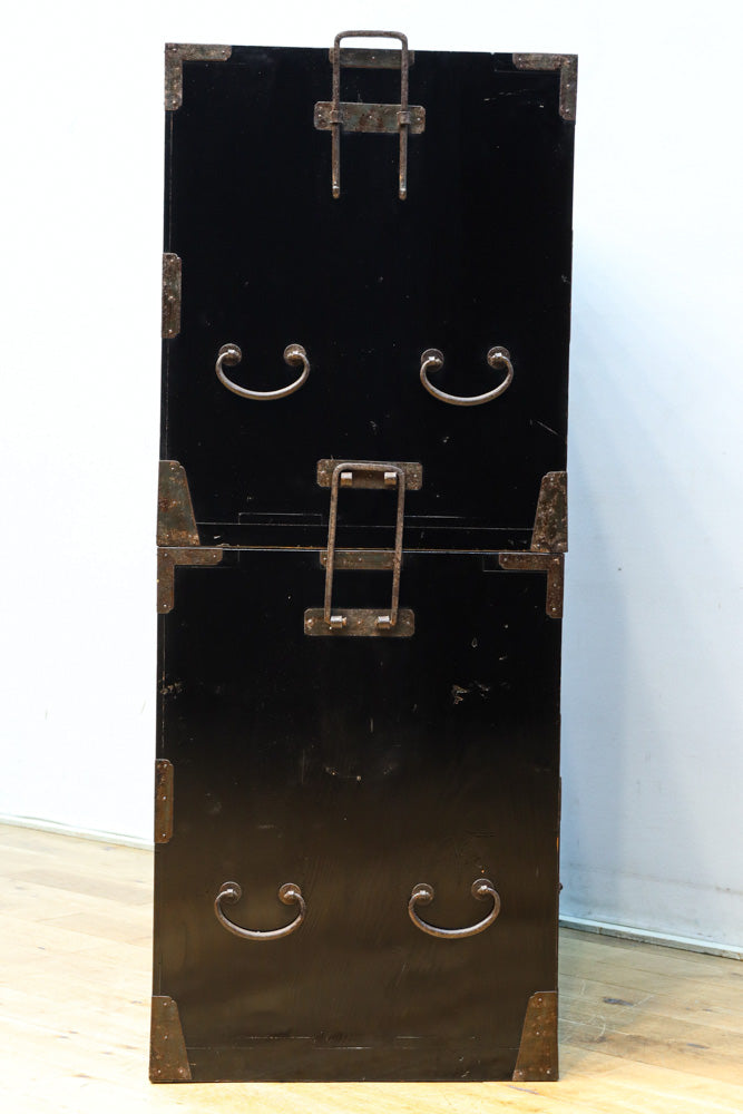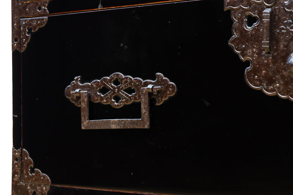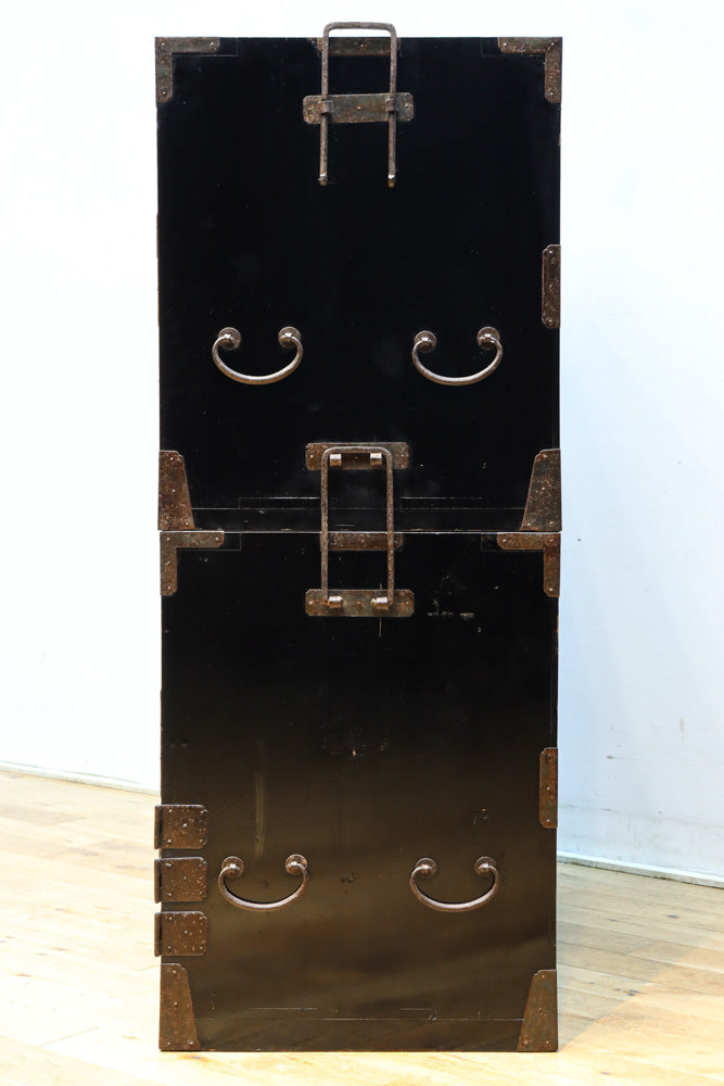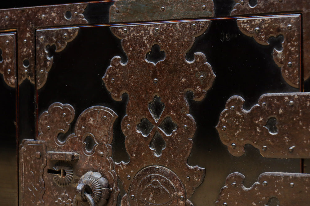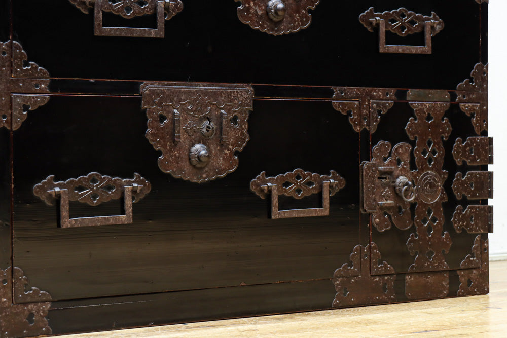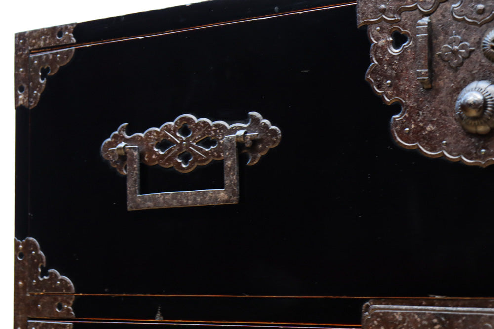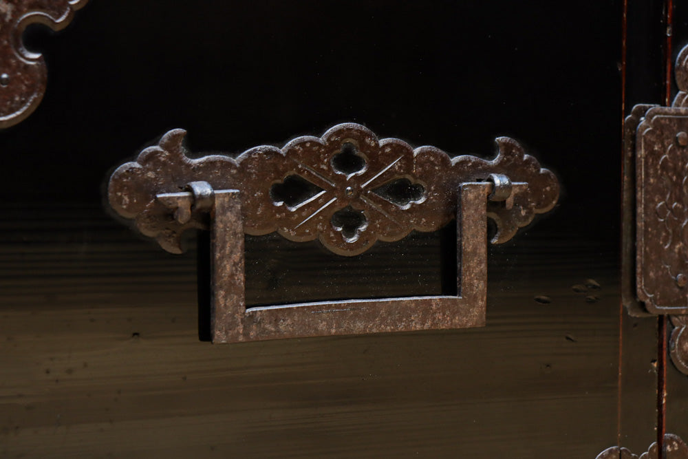 全面に黒漆を施された風情溢れる大型兜金具庄内衣裳箪笥 BB3018