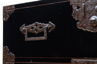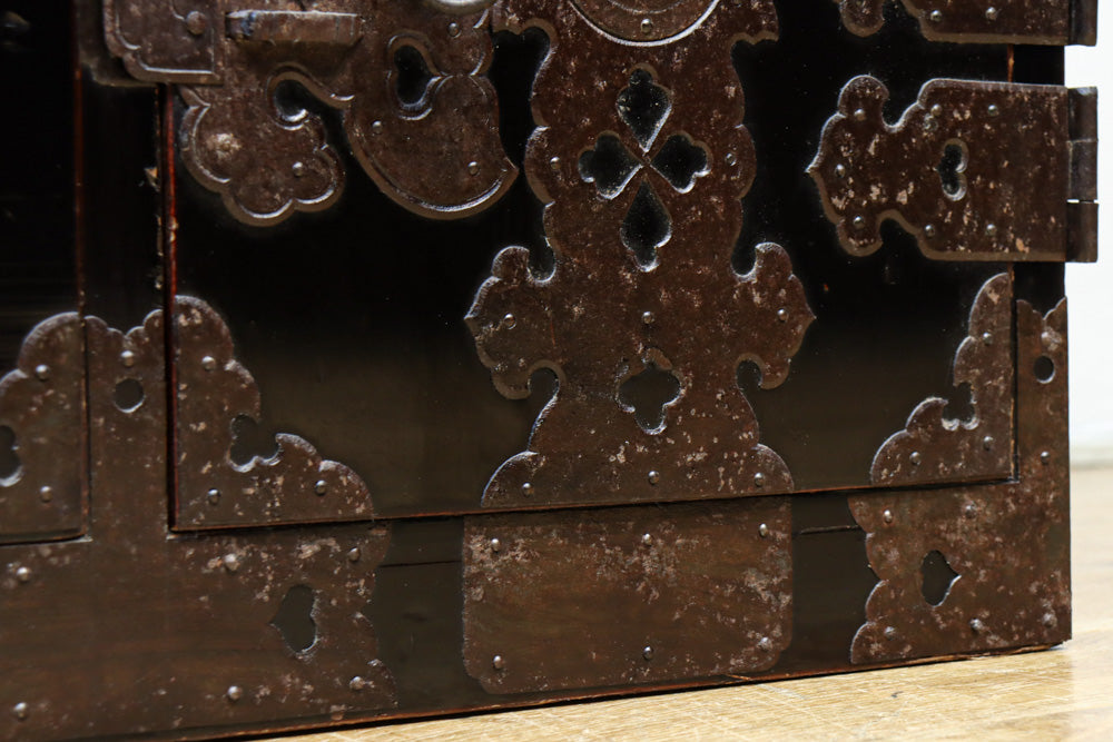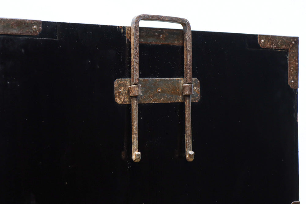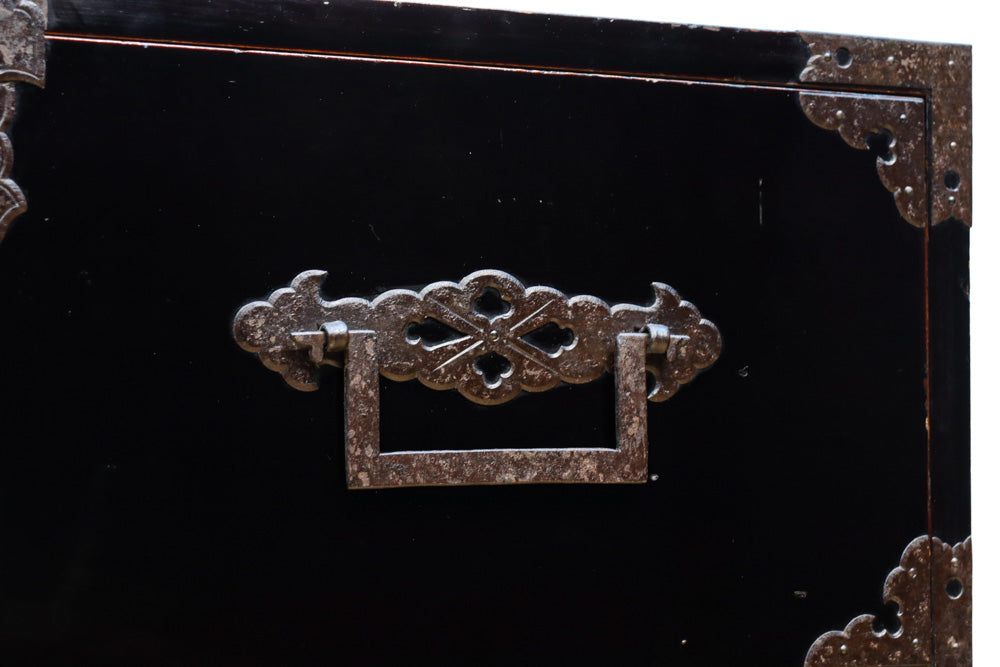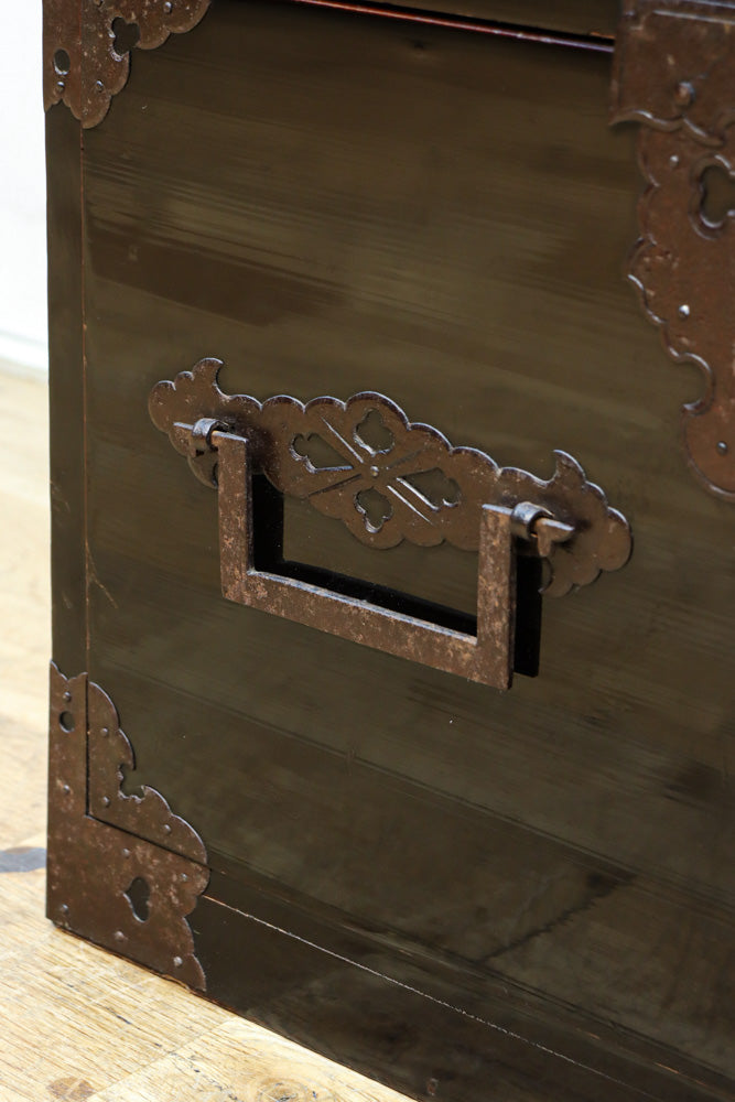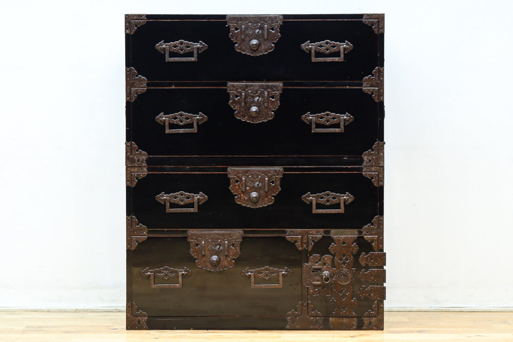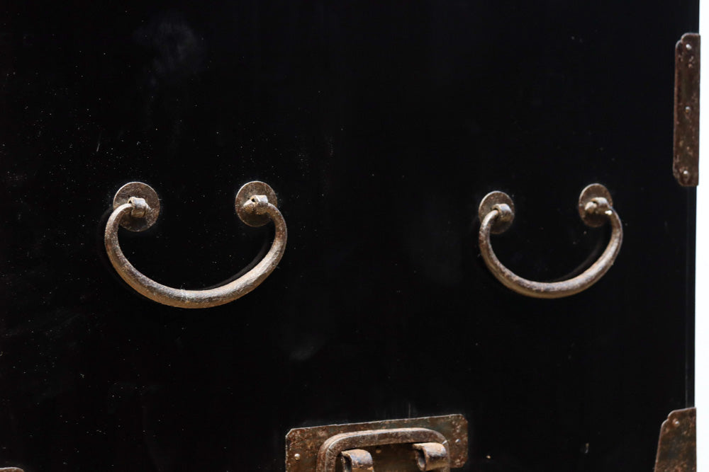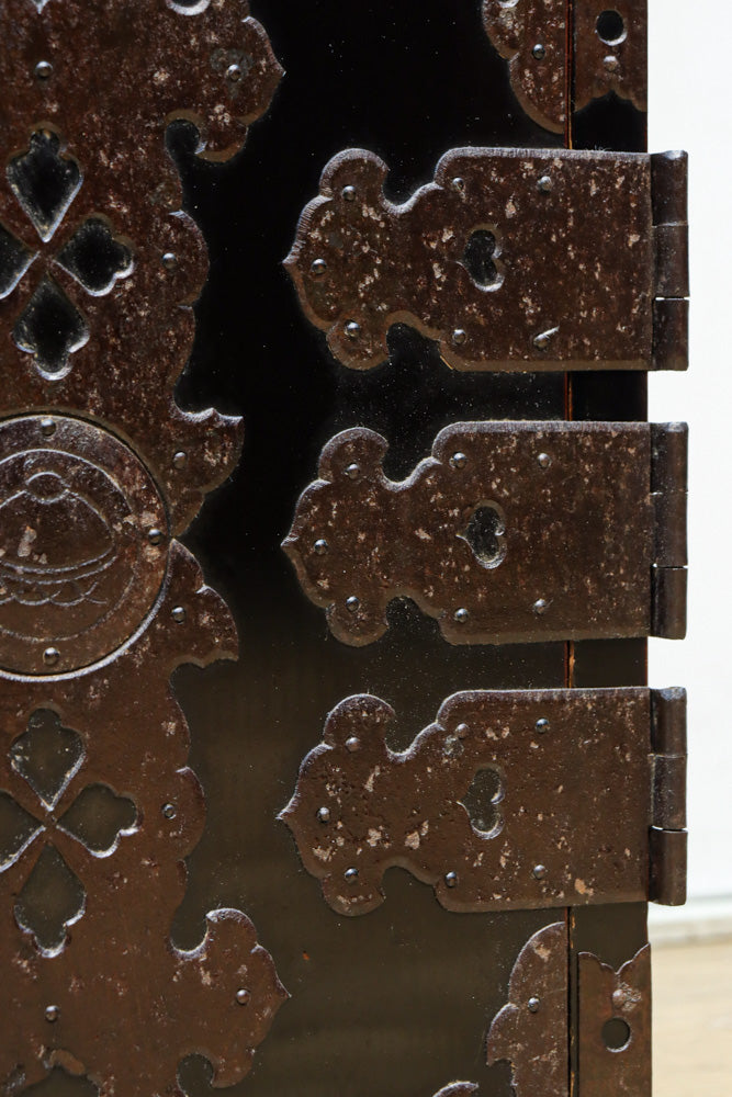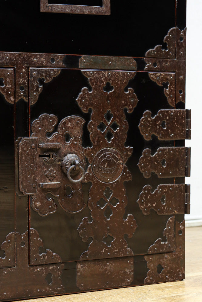 全面に黒漆を施された風情溢れる大型兜金具庄内衣裳箪笥 BB3018