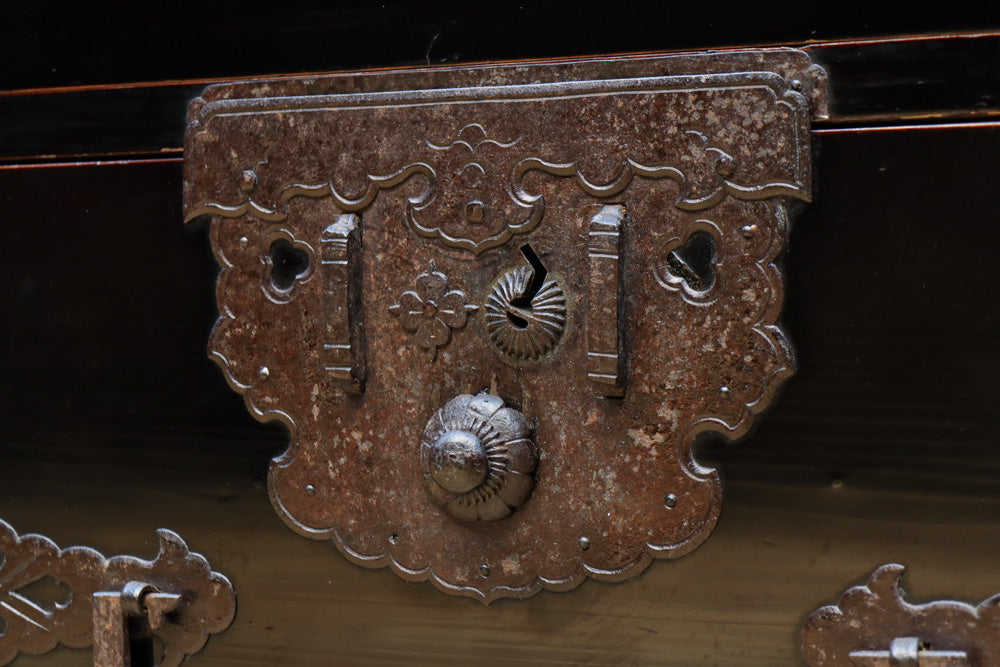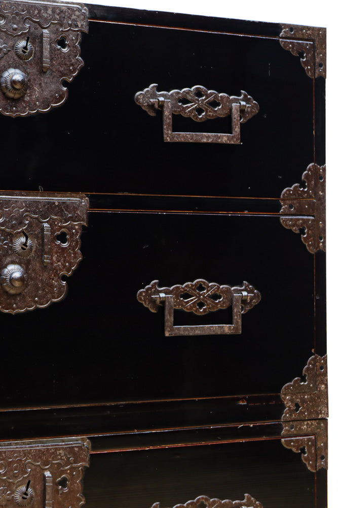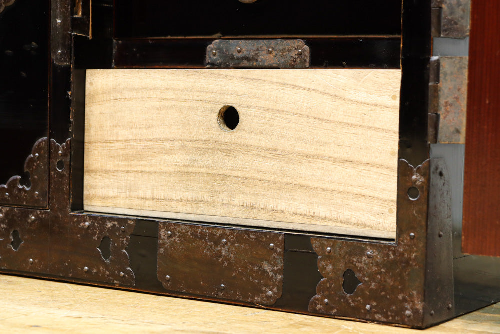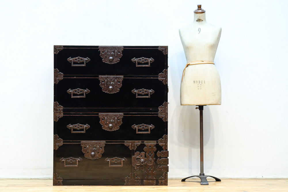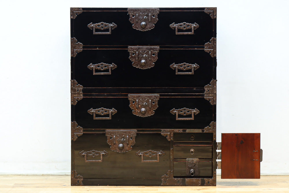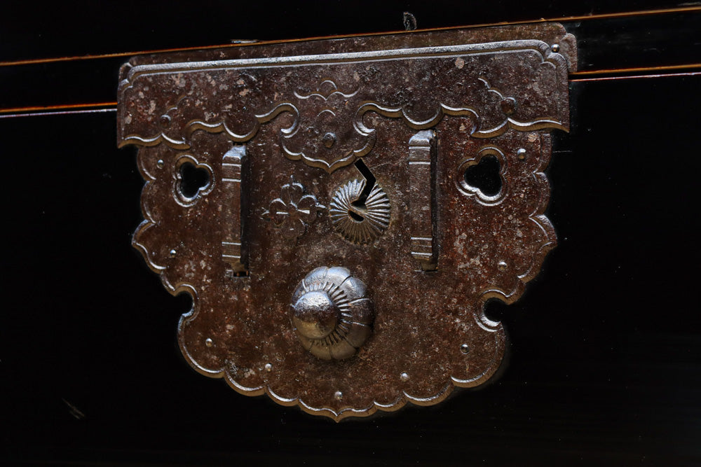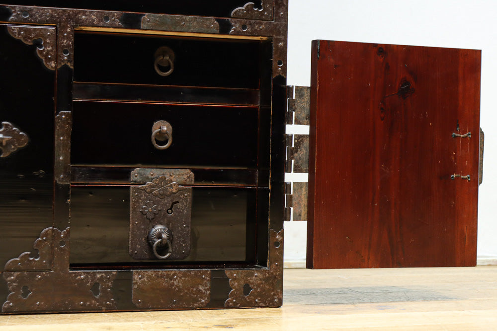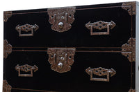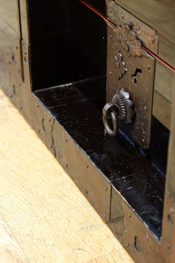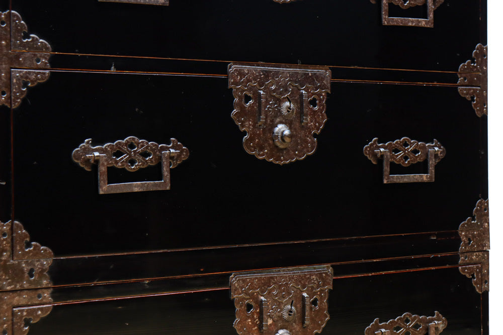 全面に黒漆を施された風情溢れる大型兜金具庄内衣裳箪笥 BB3018