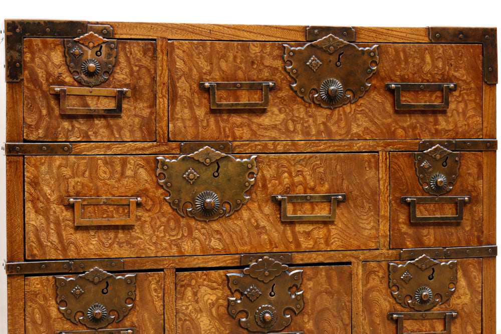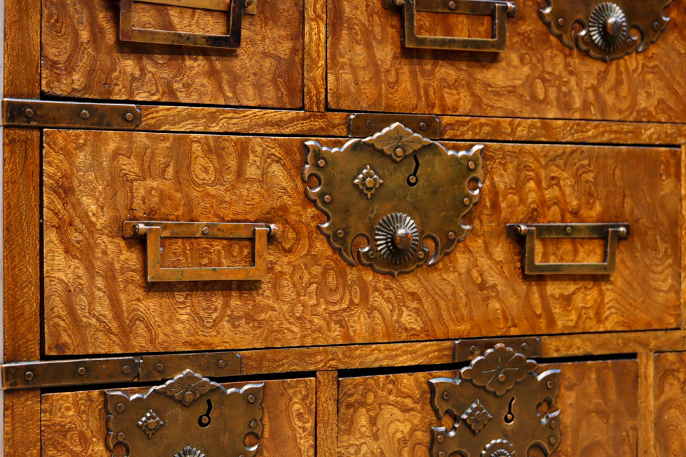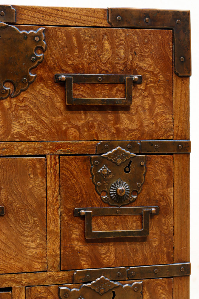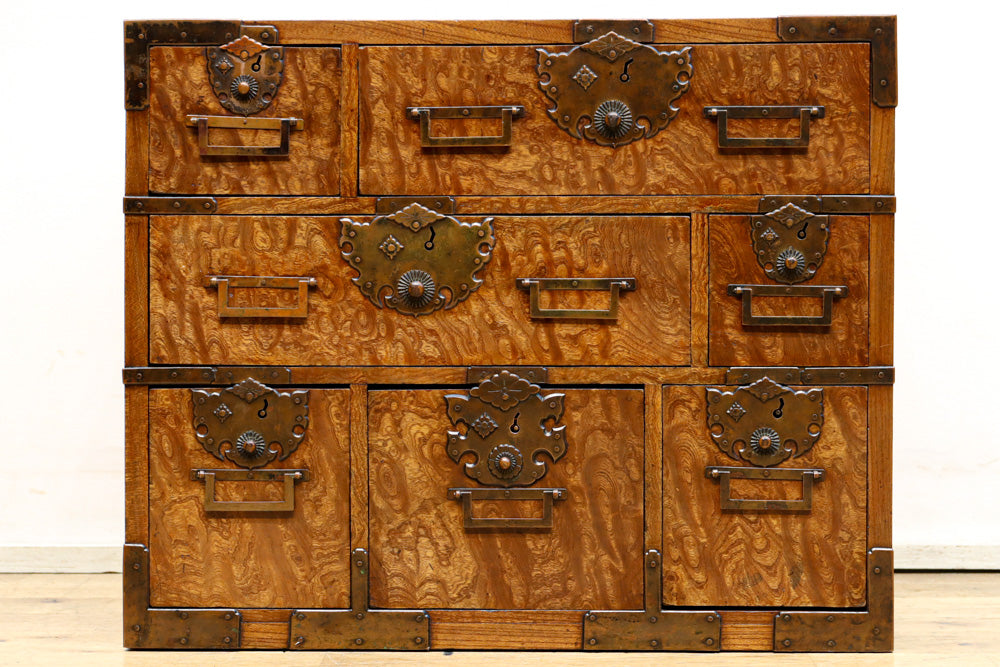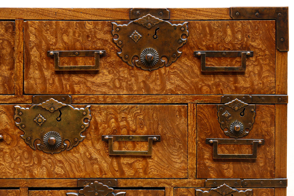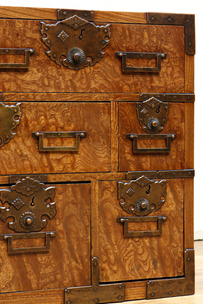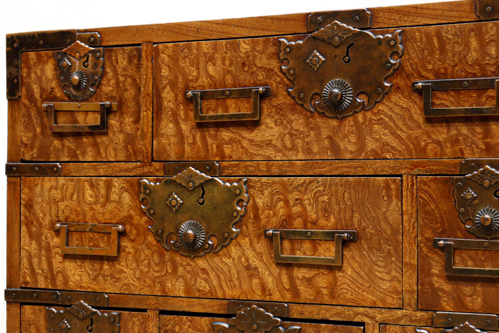 The high-quality zelkova grain, including beads, decorates the chest of drawers along with highly decorative metal fittings.