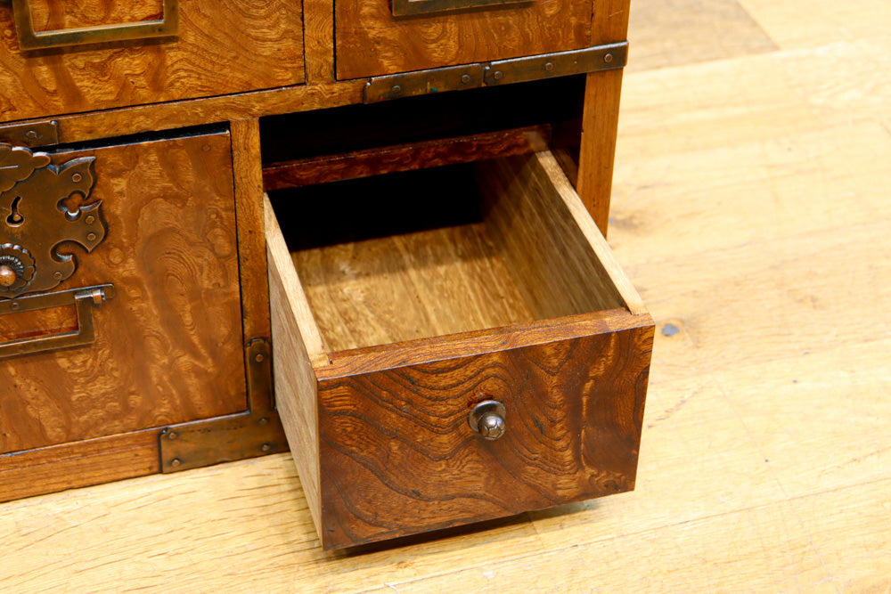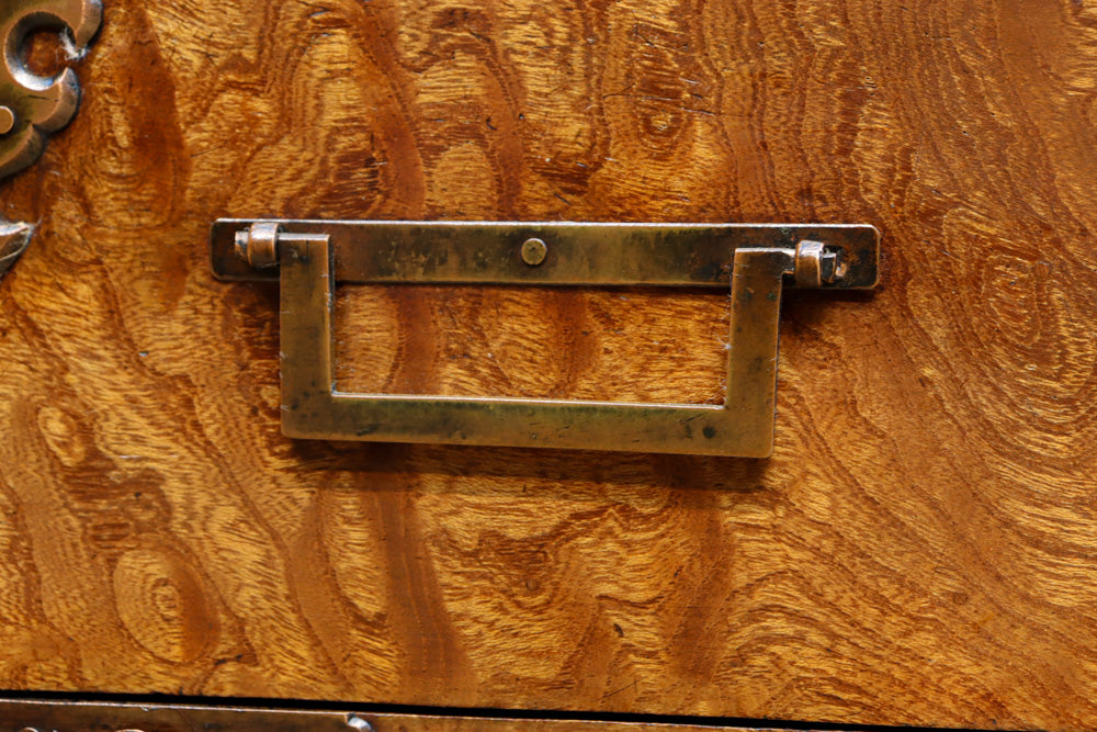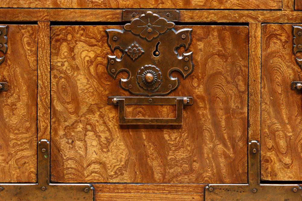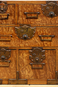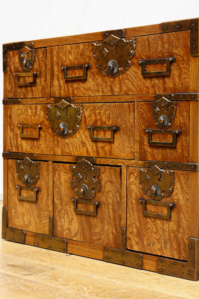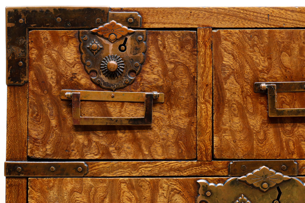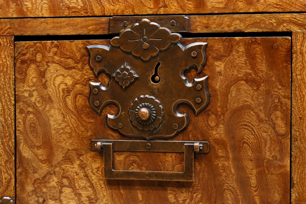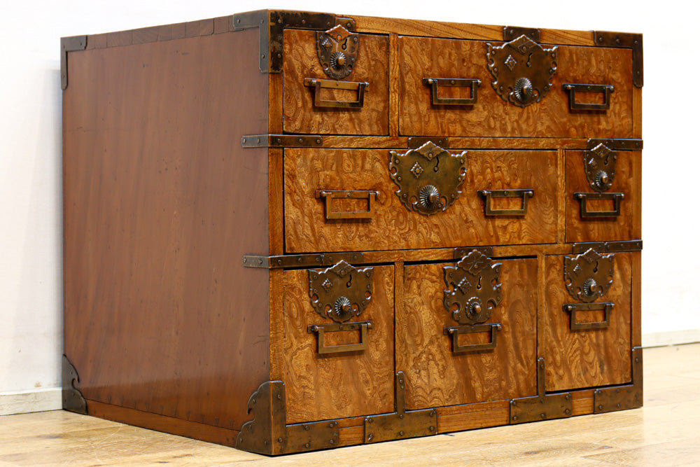 The high-quality zelkova grain, including beads, decorates the chest of drawers along with highly decorative metal fittings.