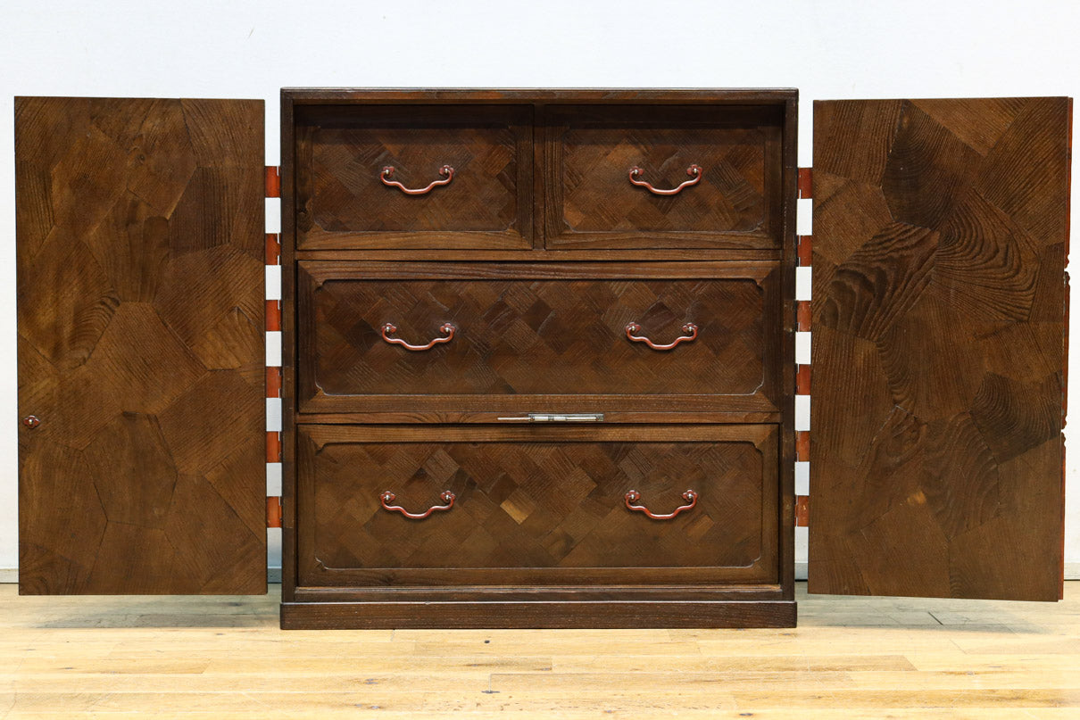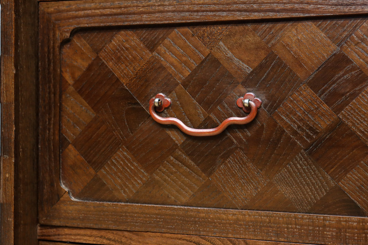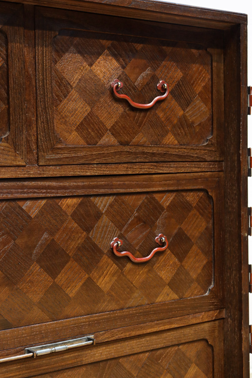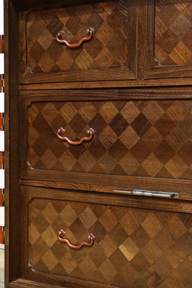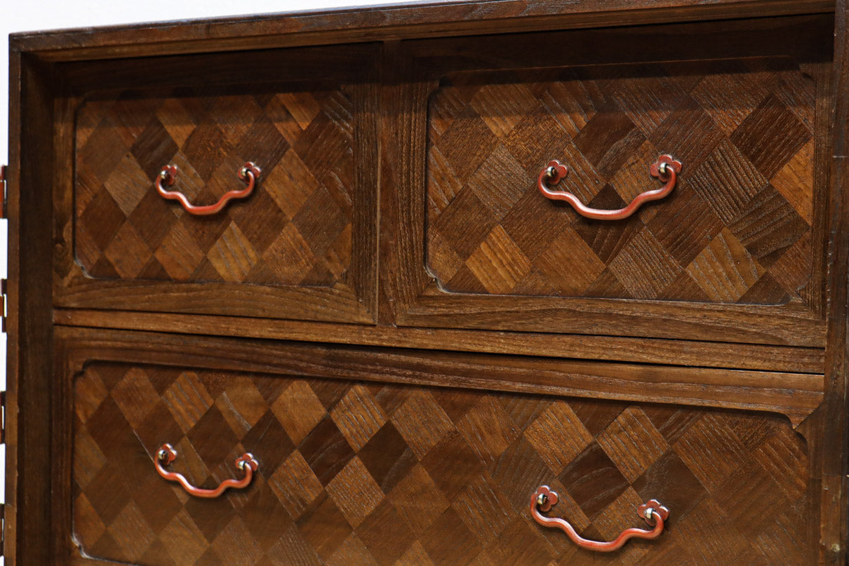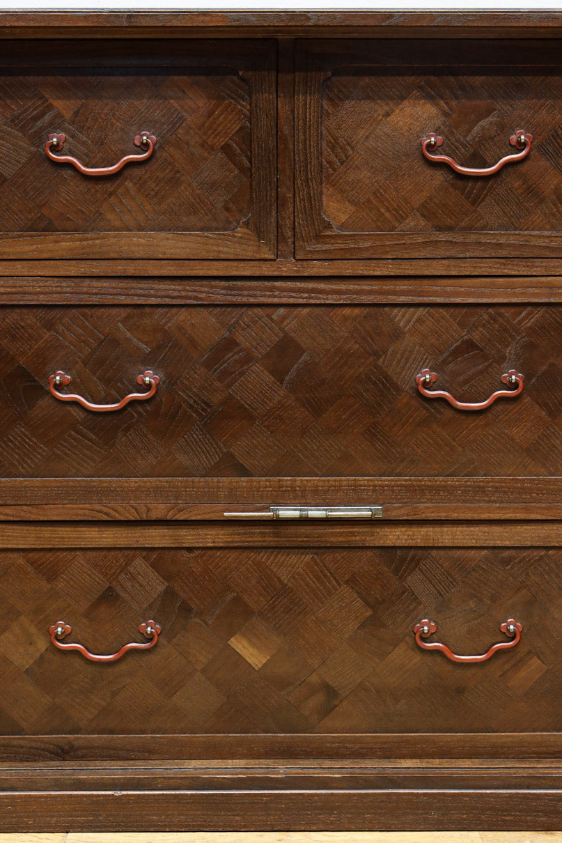 The parquet is decorated with elegant decorative hardware and pull handle hardware with a slightly vermilion-like texture, making it a small chest of drawers with a high degree of interior design, along with the shades of color.