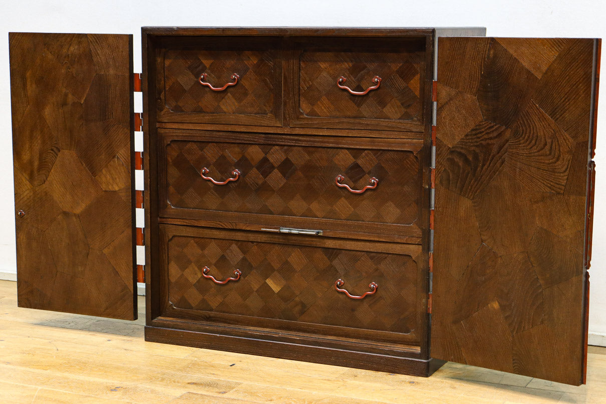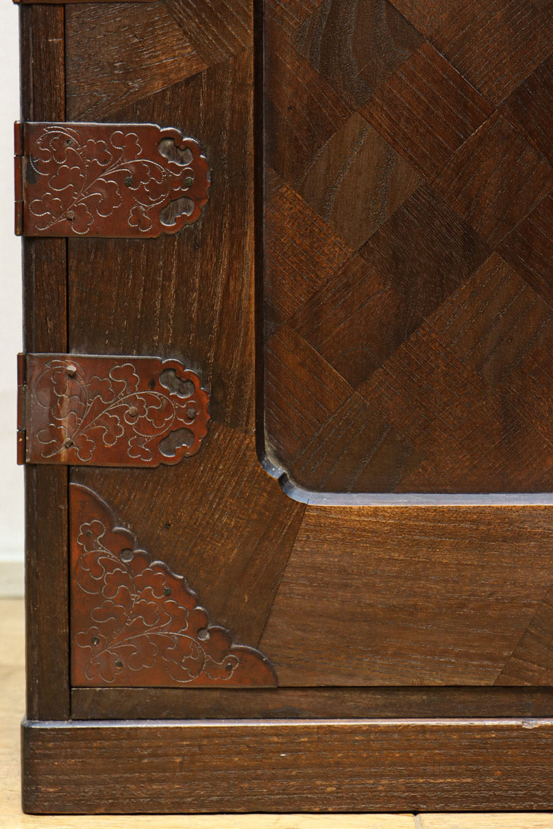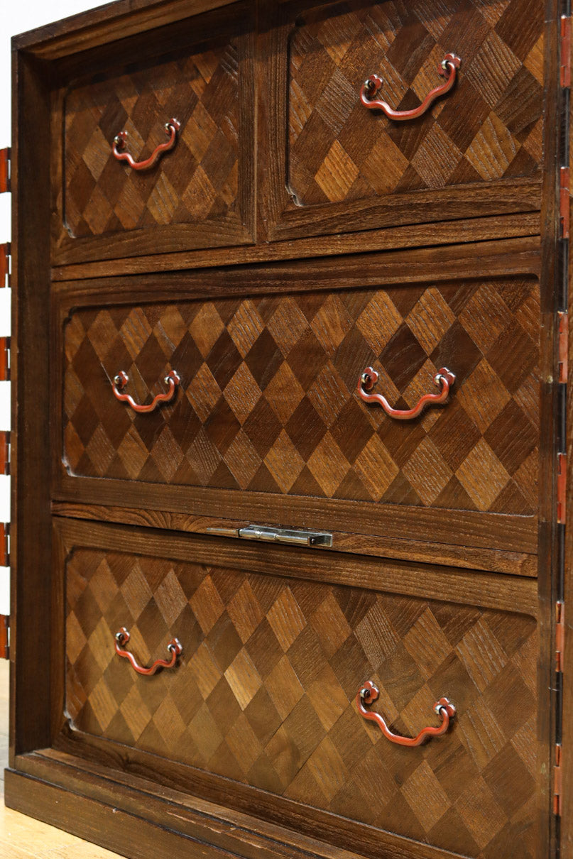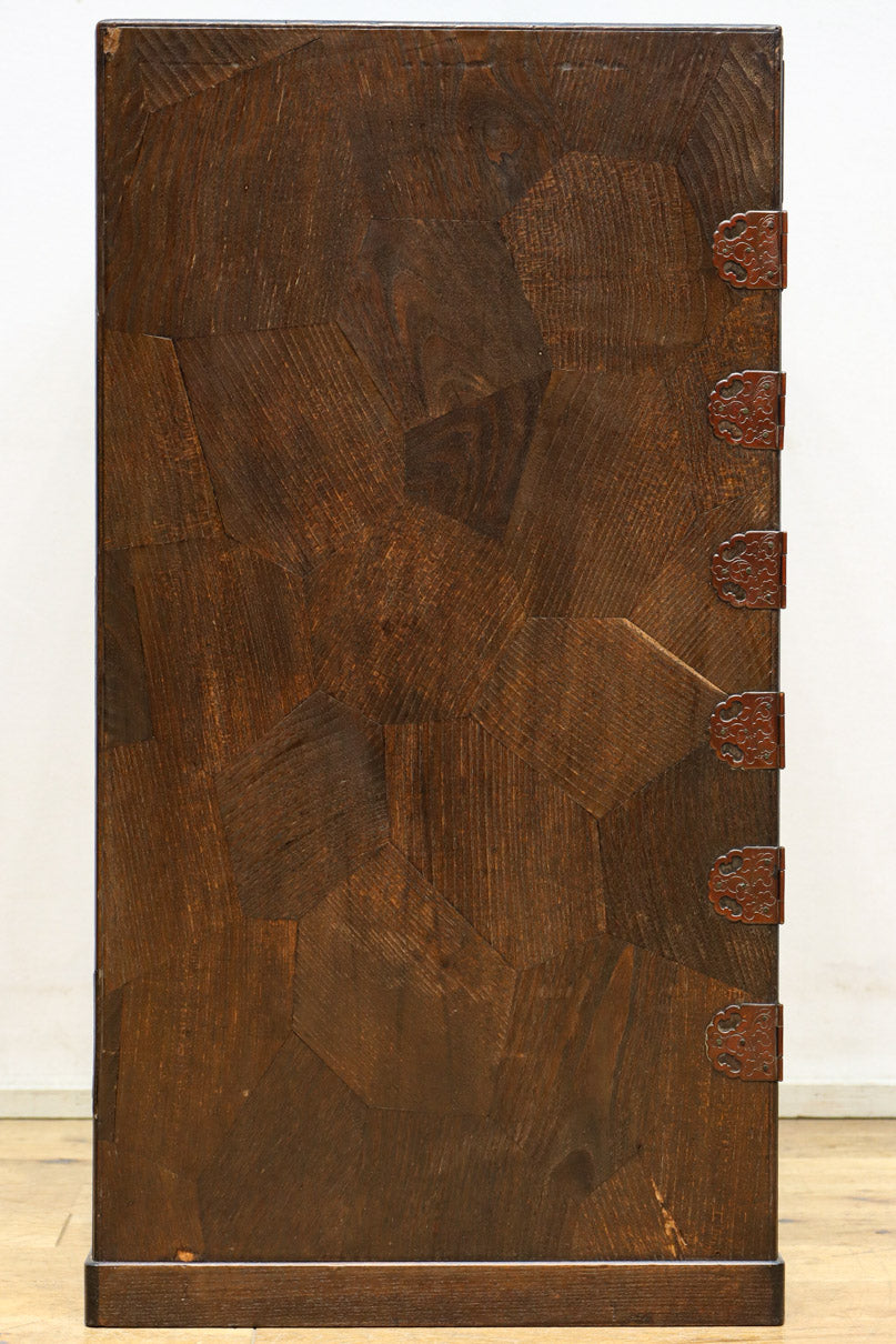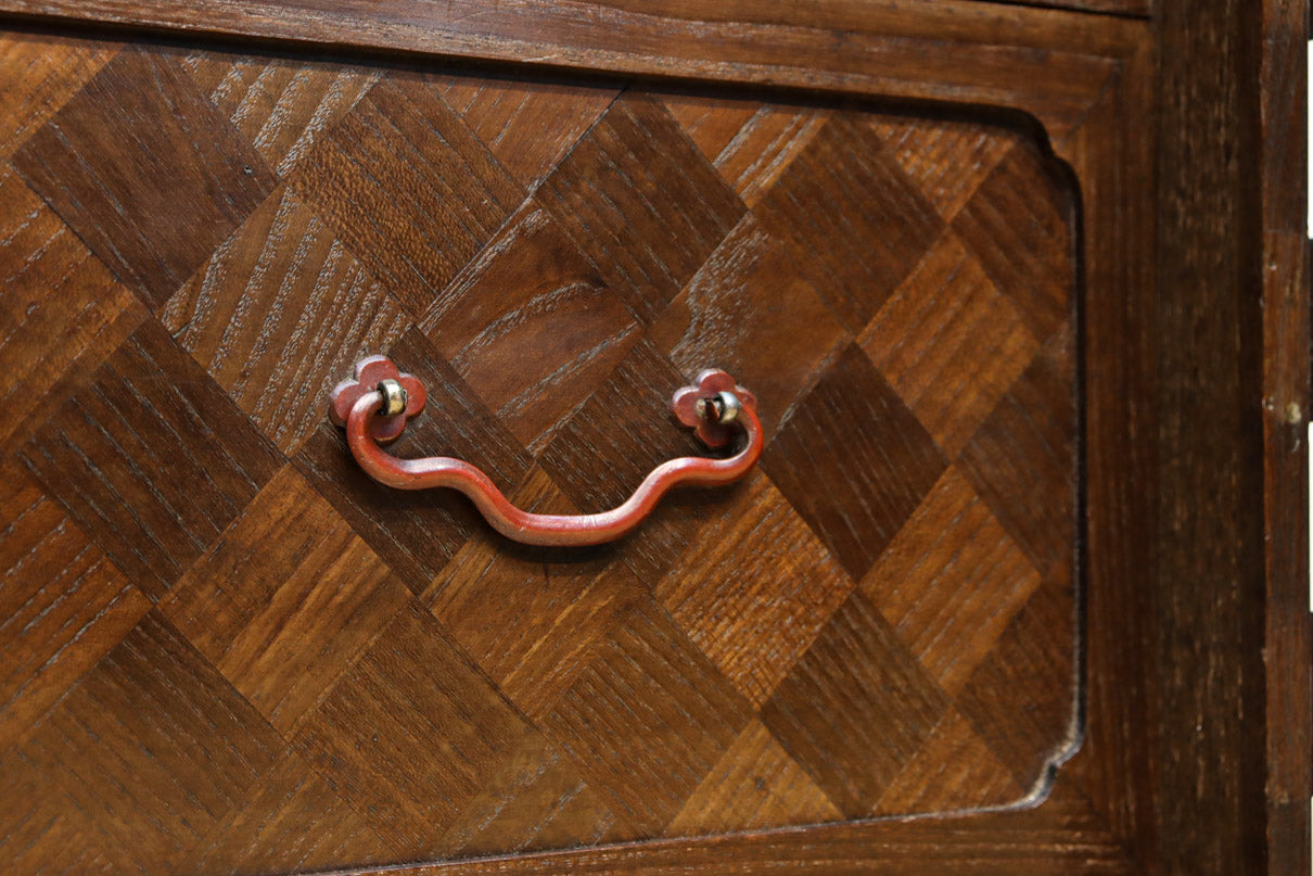 The parquet is decorated with elegant decorative hardware and pull handle hardware with a slightly vermilion-like texture, making it a small chest of drawers with a high degree of interior design, along with the shades of color.