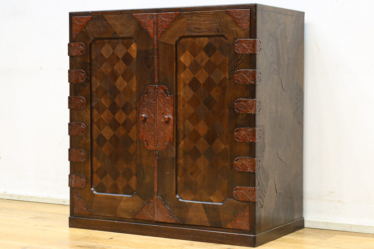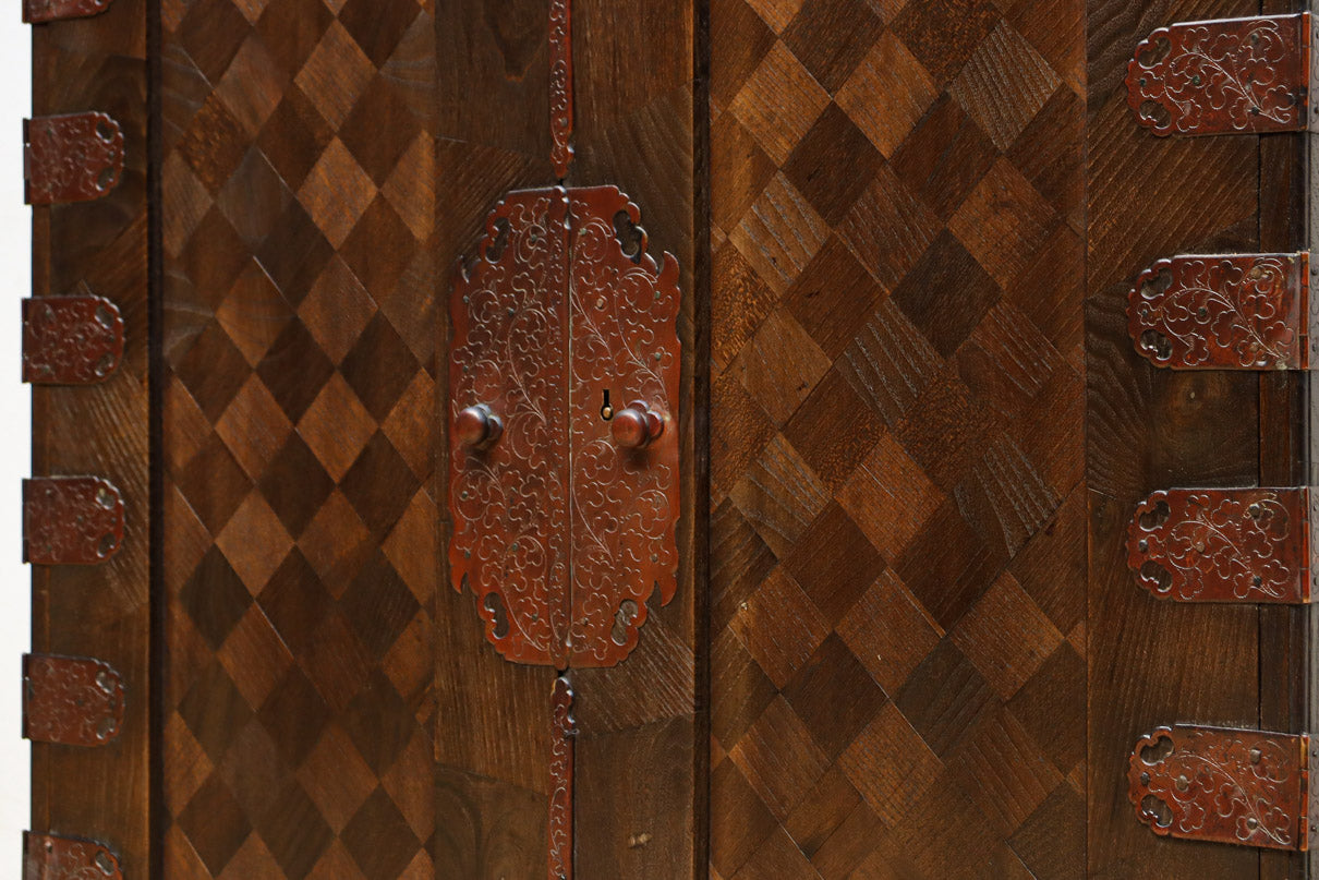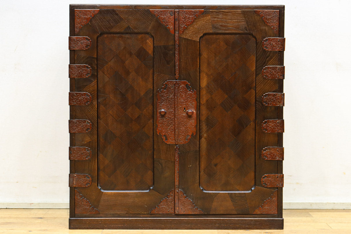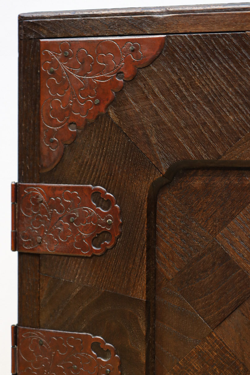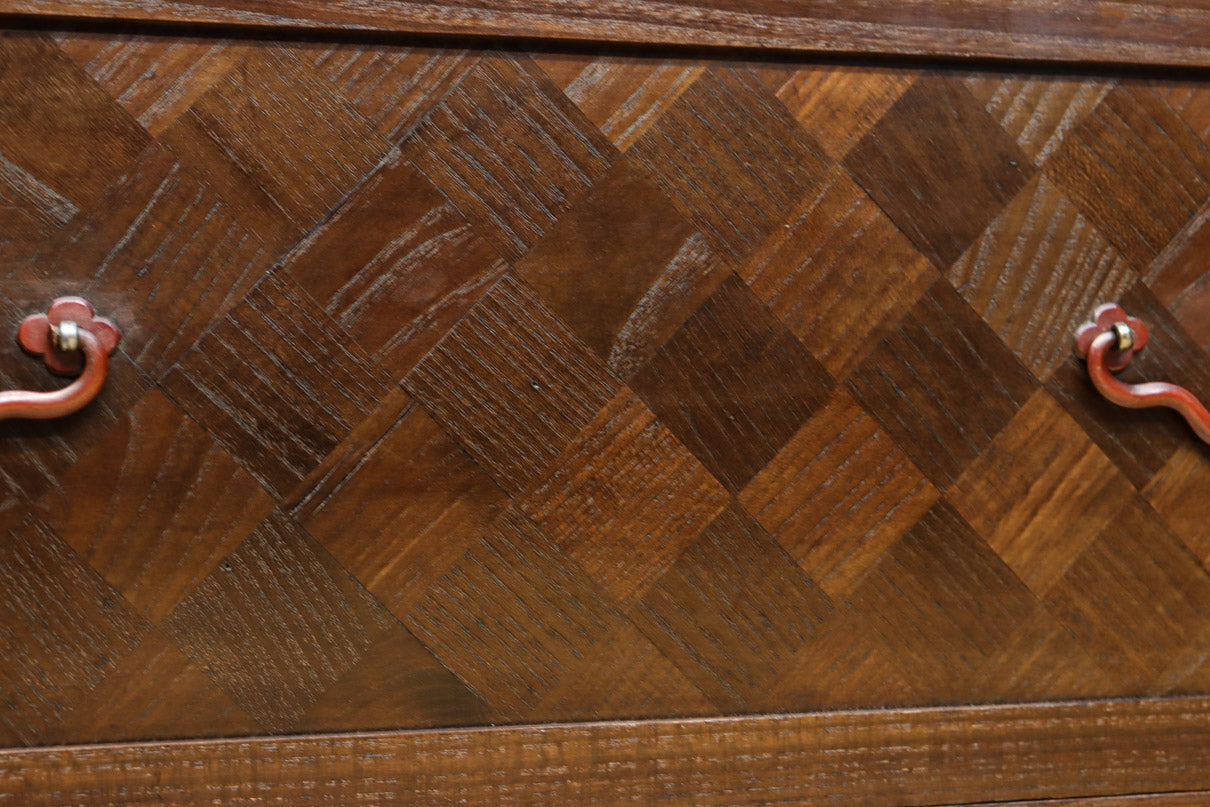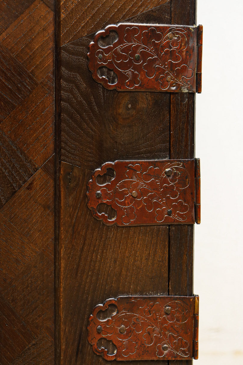 The parquet is decorated with elegant decorative hardware and pull handle hardware with a slightly vermilion-like texture, making it a small chest of drawers with a high degree of interior design, along with the shades of color.