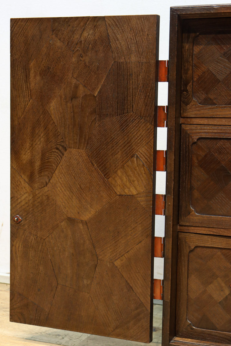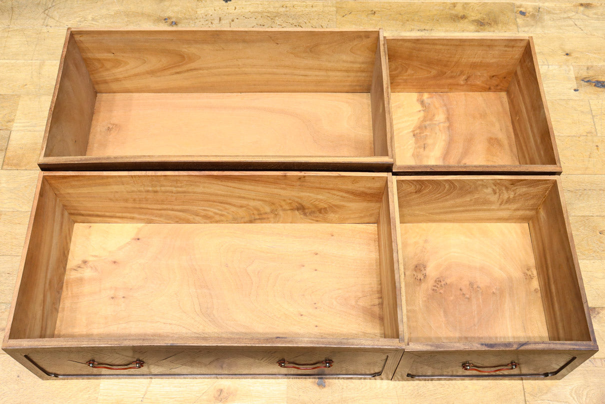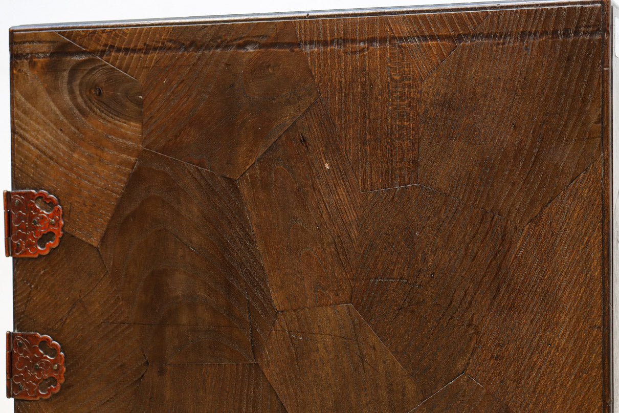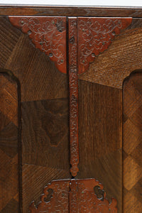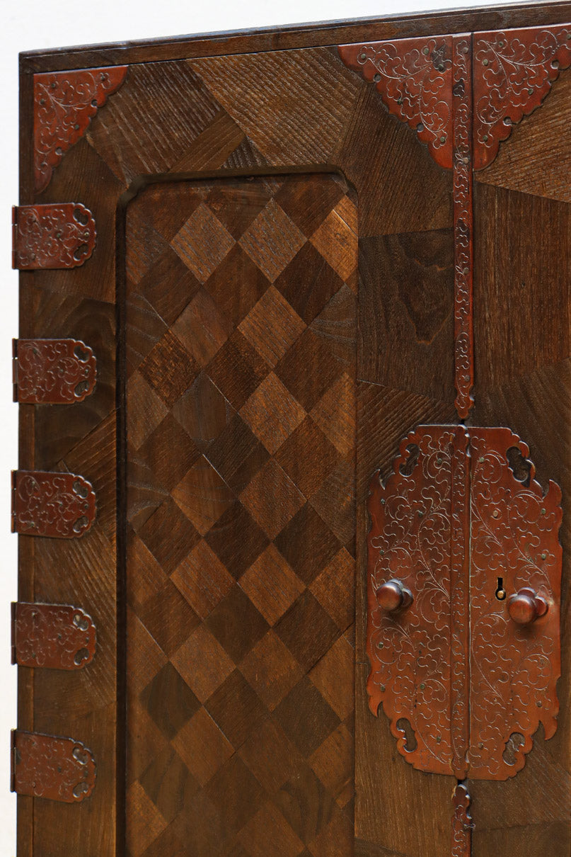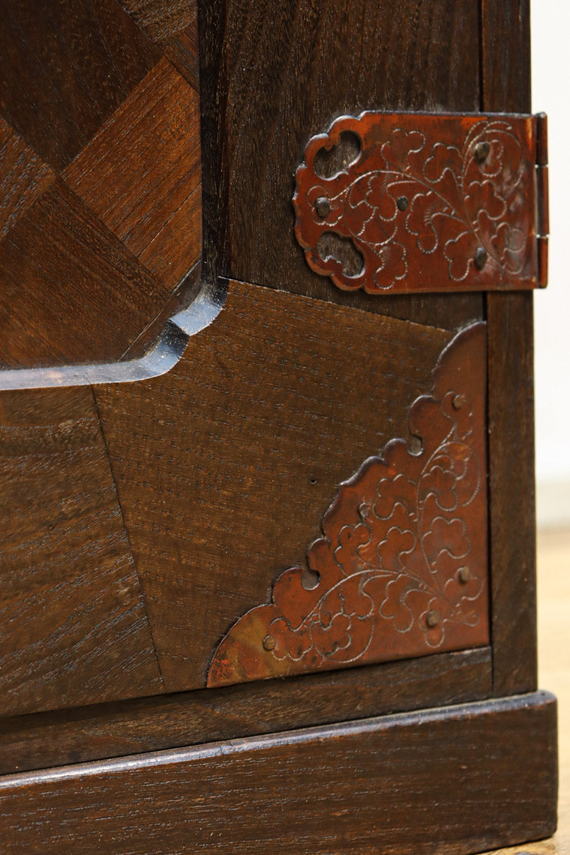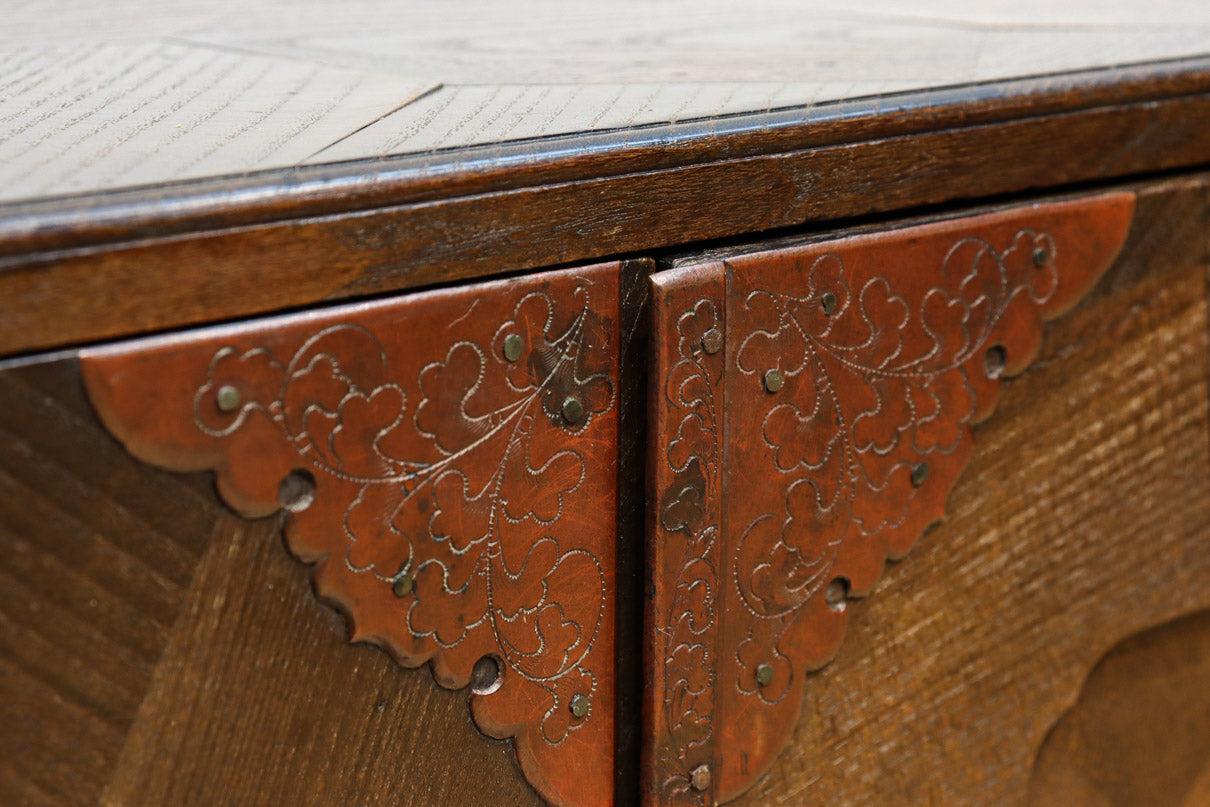The parquet is decorated with elegant decorative hardware and pull handle hardware with a slightly vermilion-like texture, making it a small chest of drawers with a high degree of interior design, along with the shades of color.