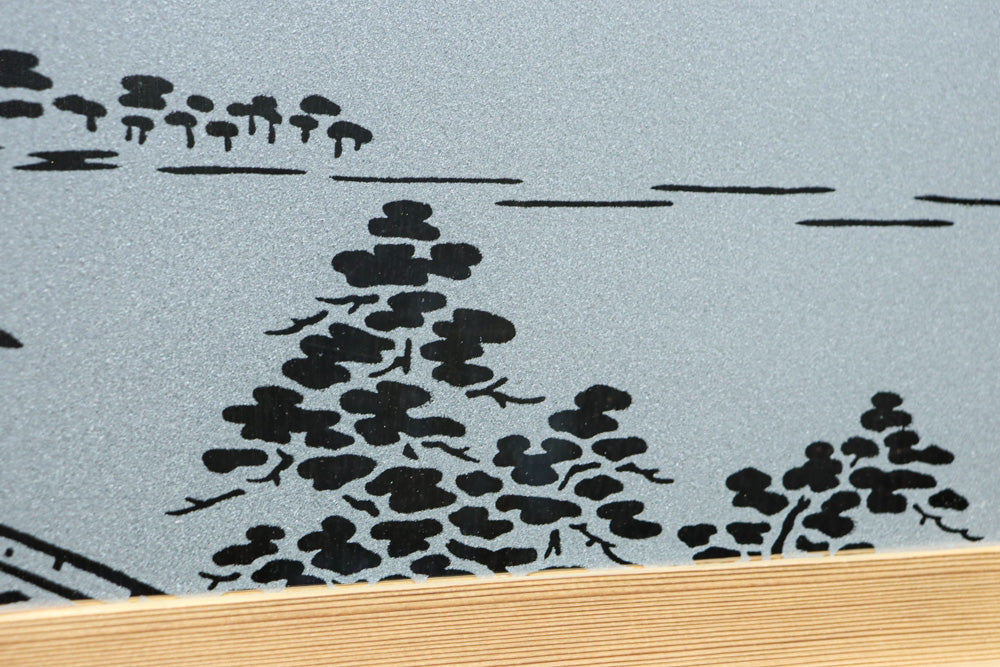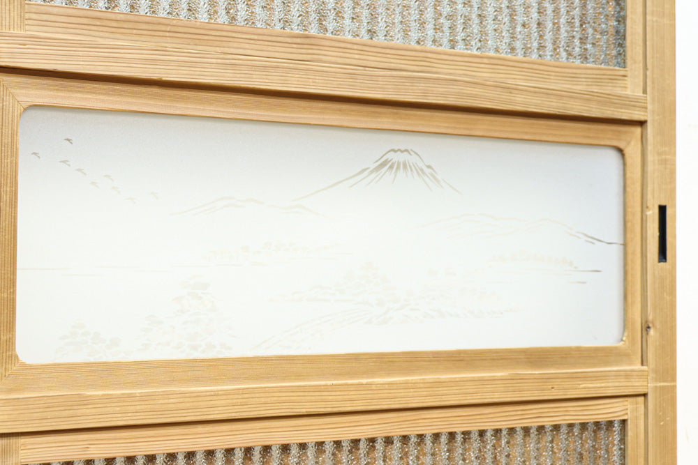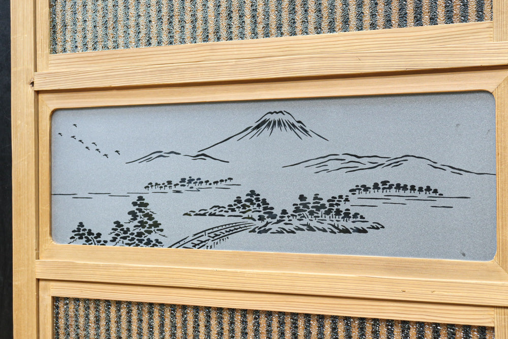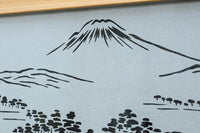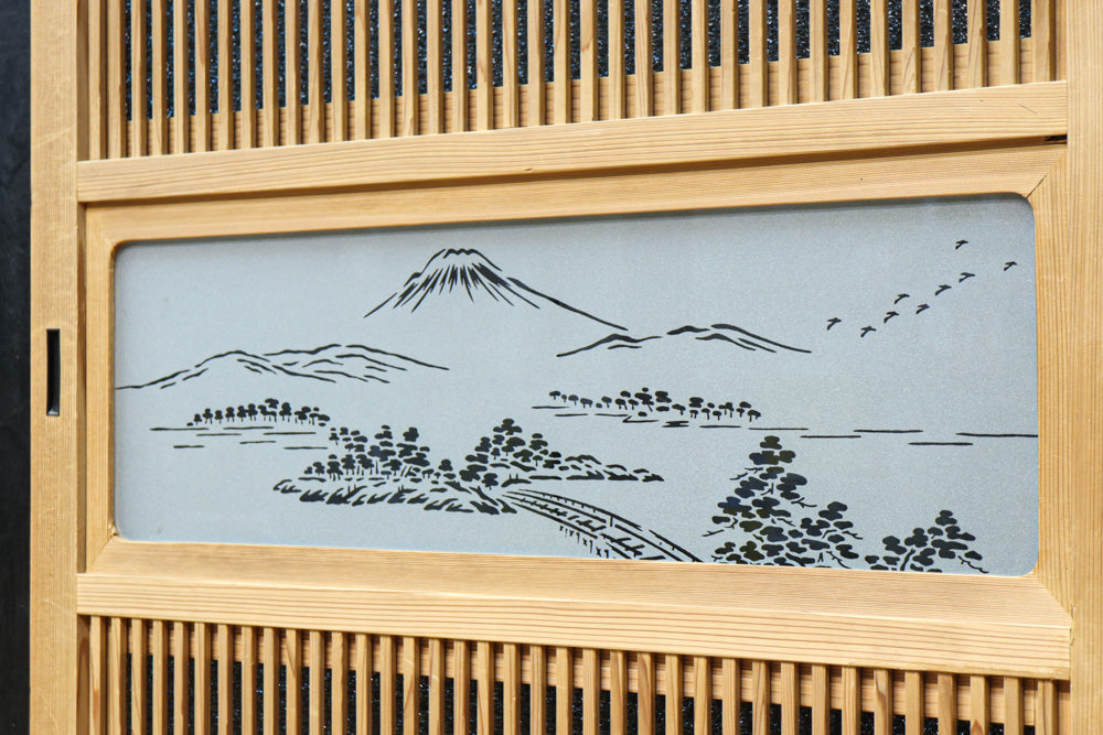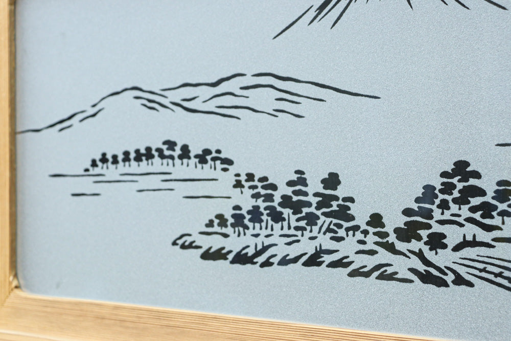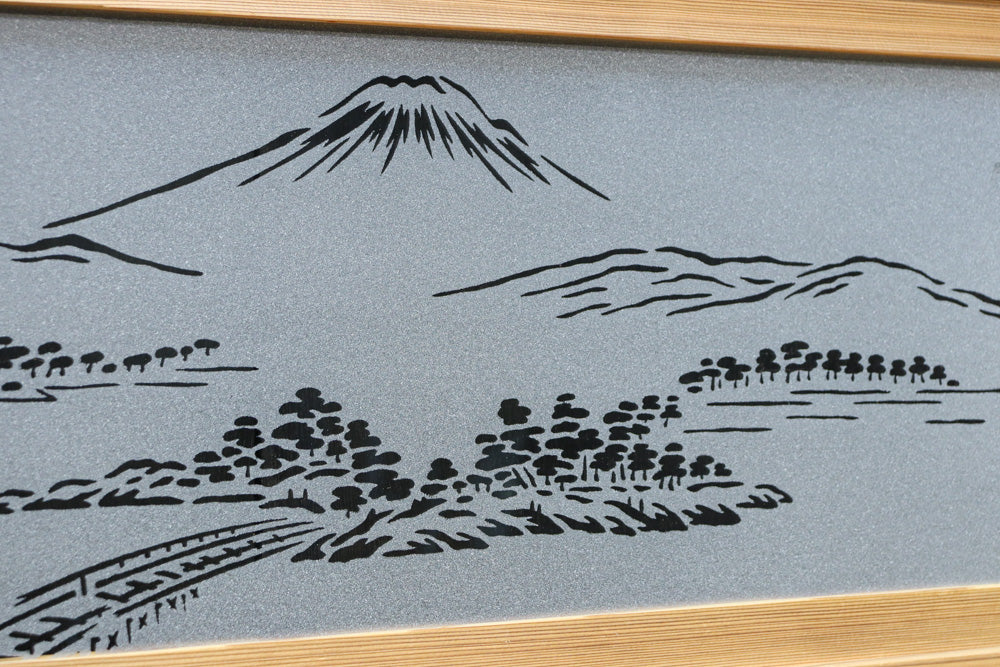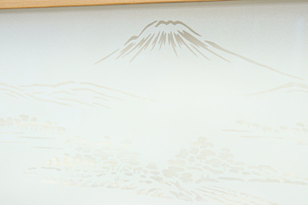 It is fitted with a glass glass that depicts a landscape painting of Mt. Fuji.