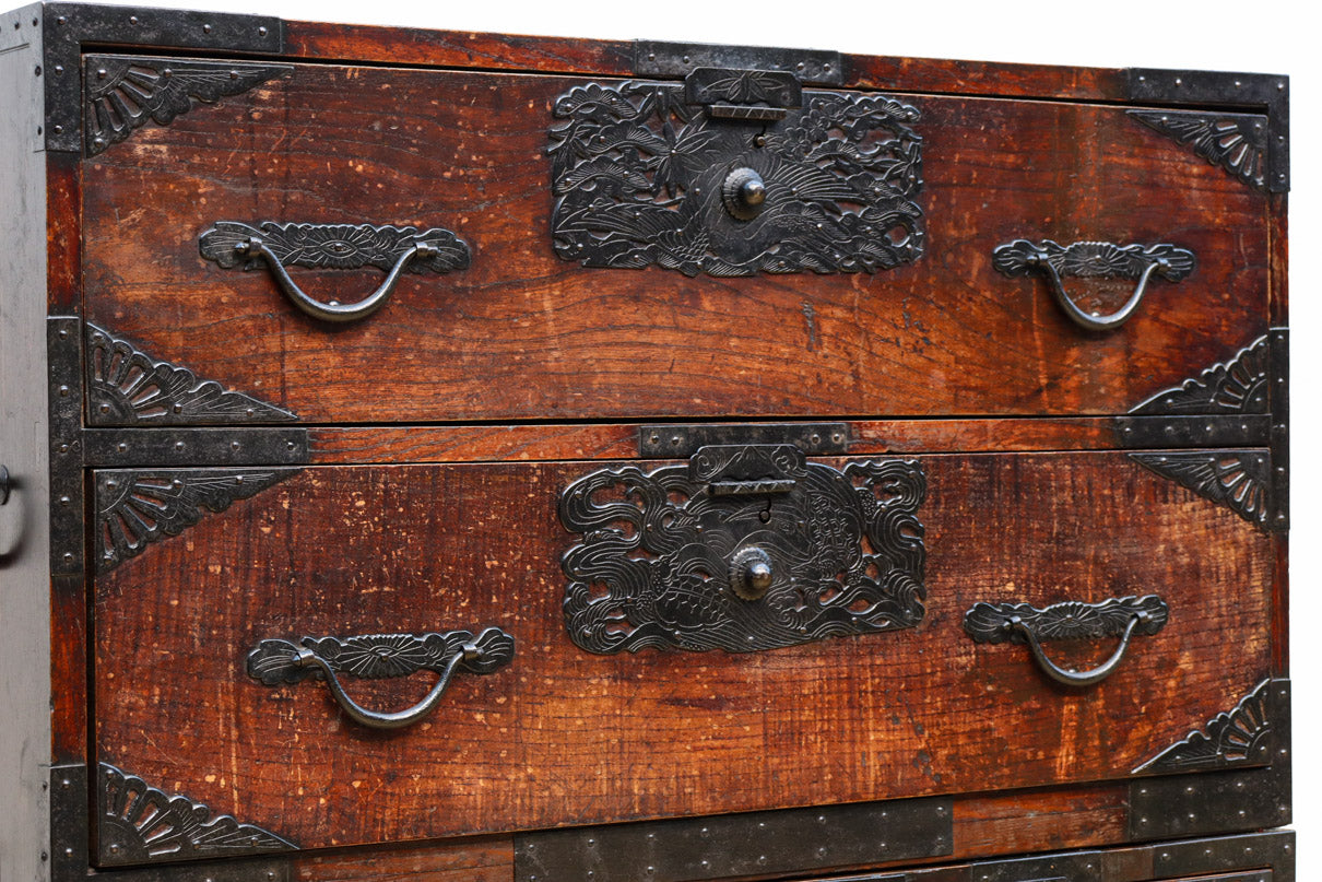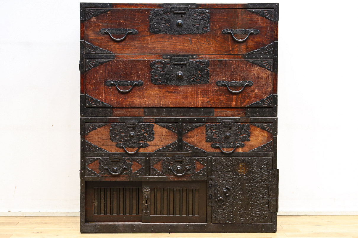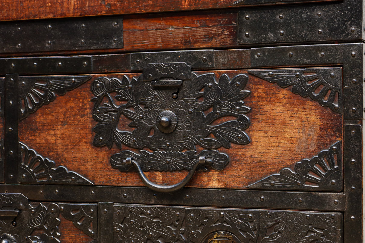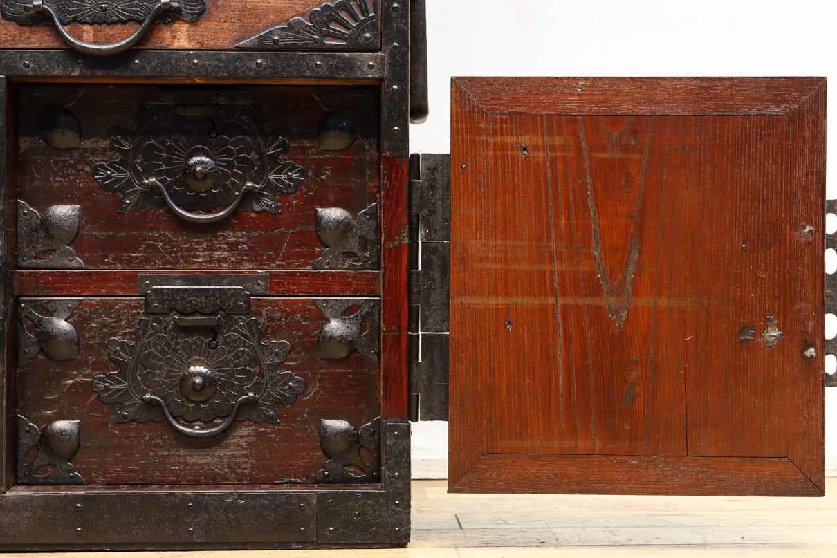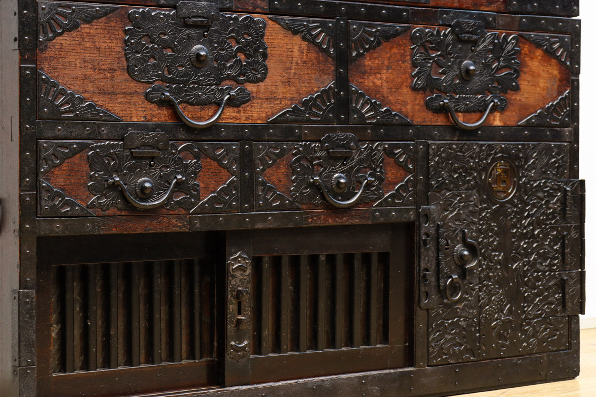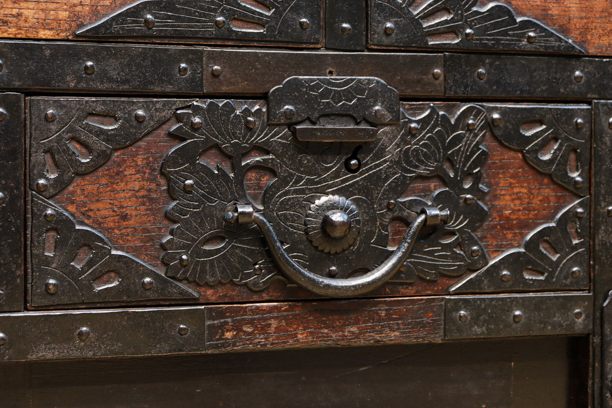 見事な装飾金具と小さな引き戸を備えたデザインが特徴的な箪笥ですので、