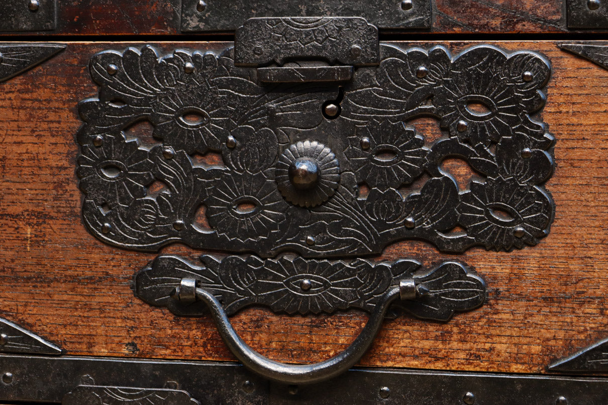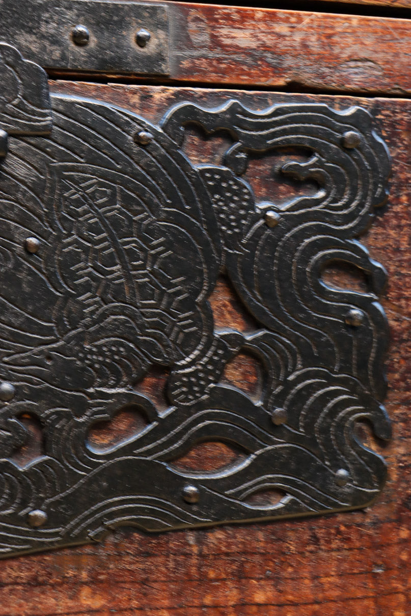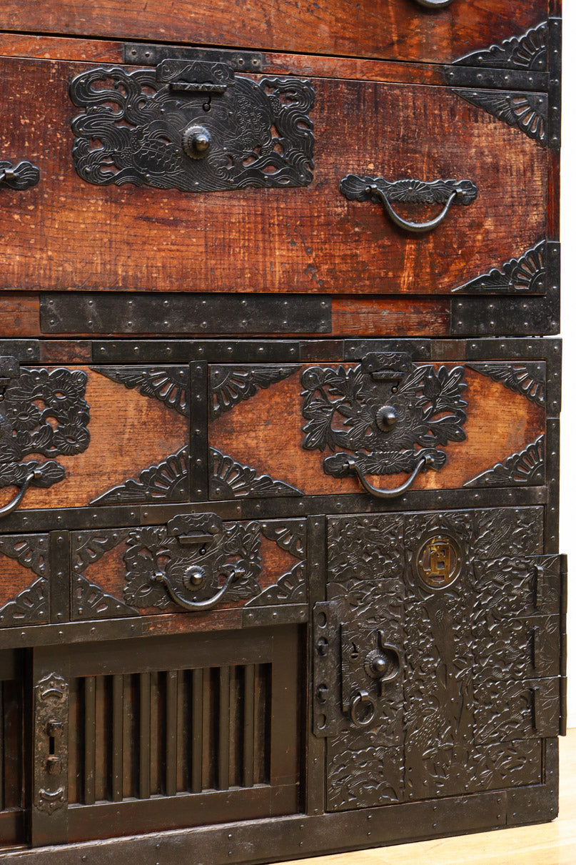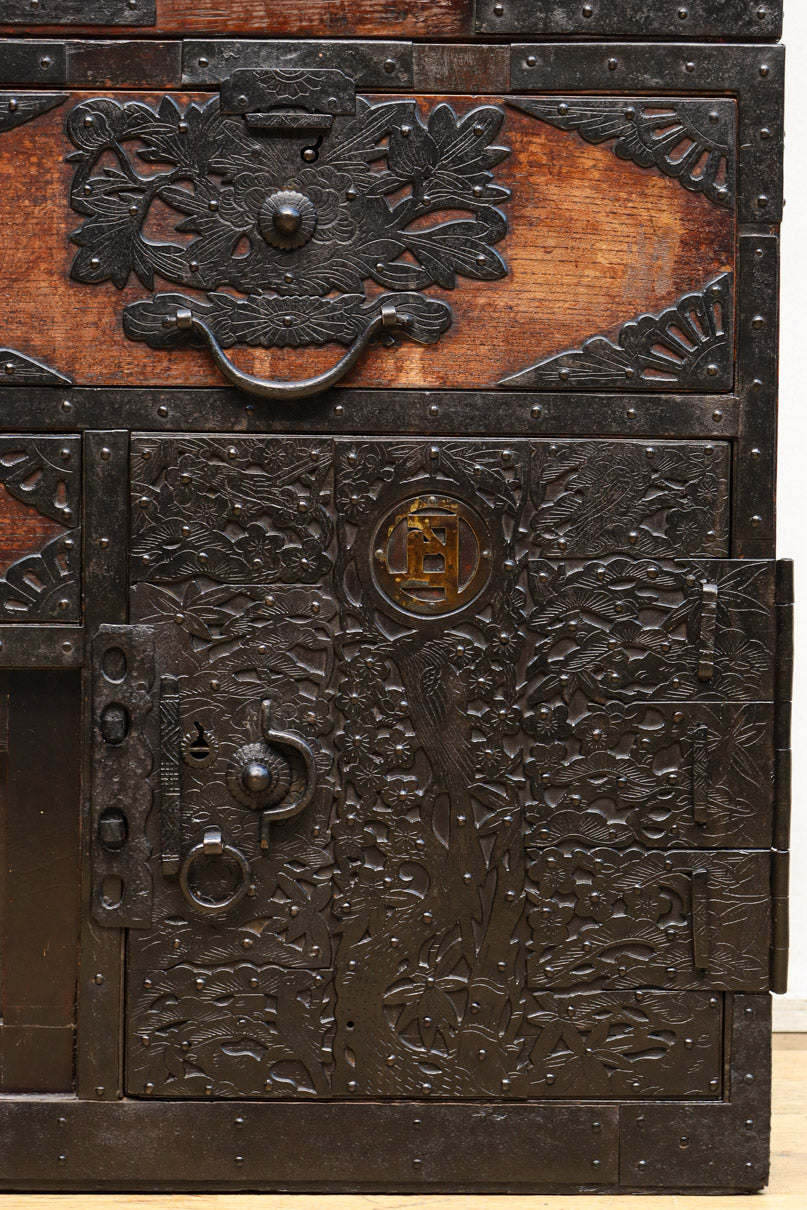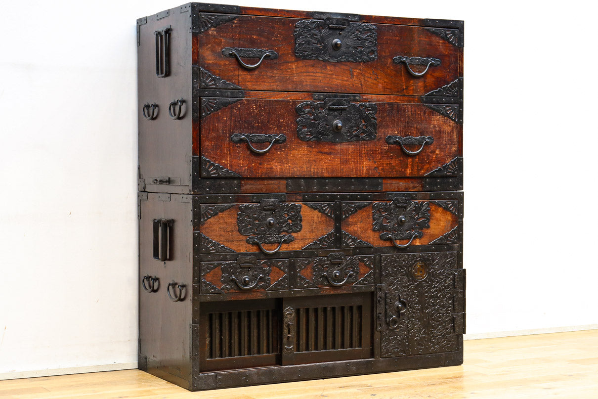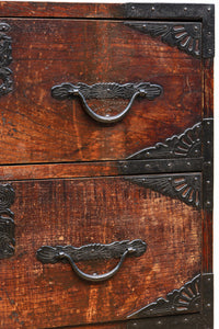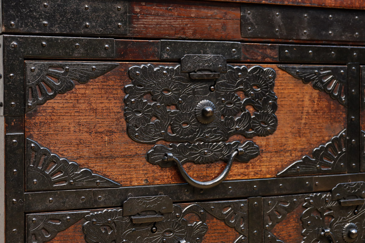 見事な装飾金具と小さな引き戸を備えたデザインが特徴的な箪笥ですので、