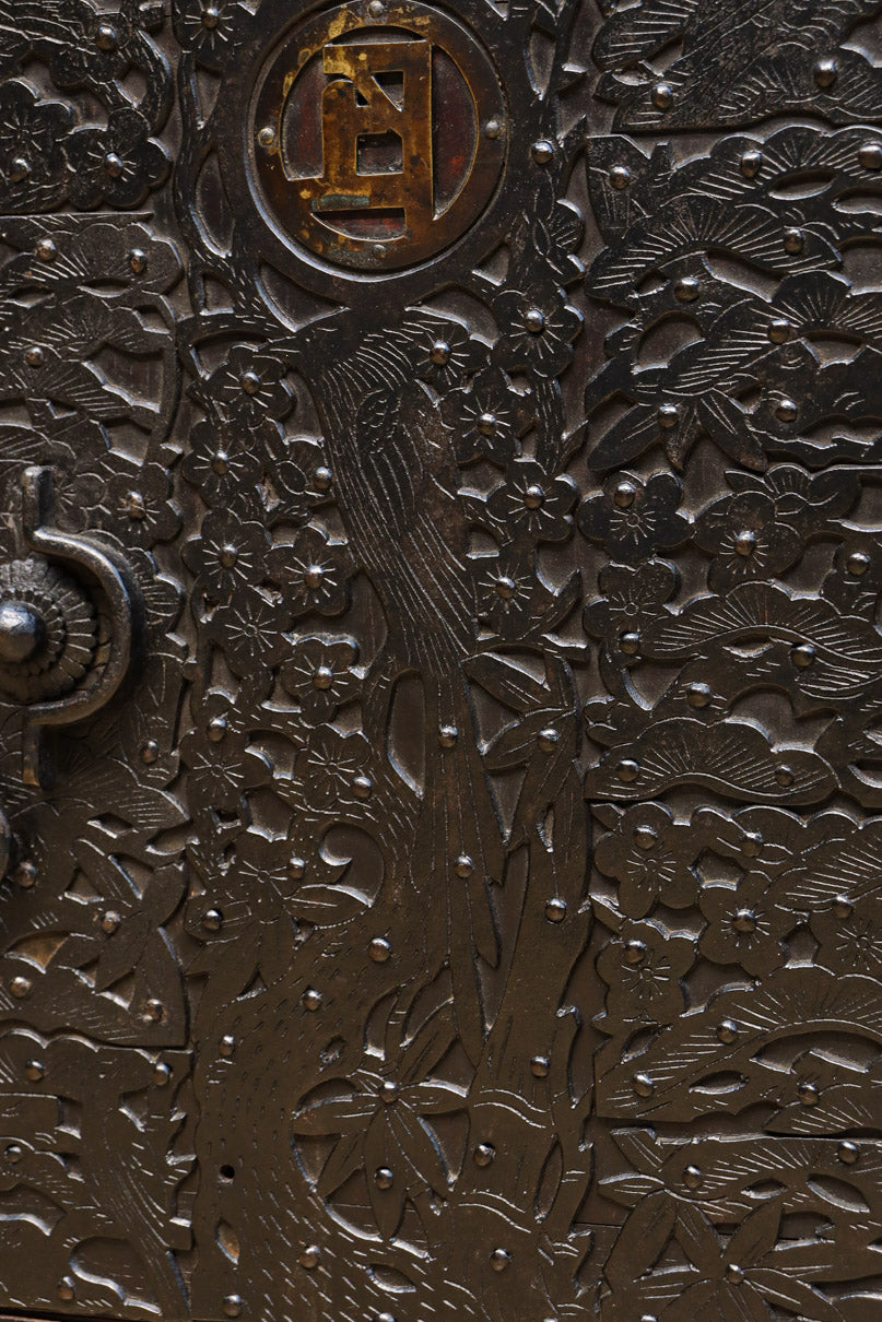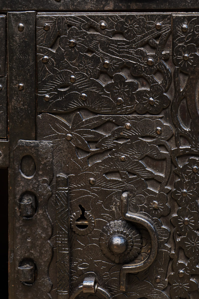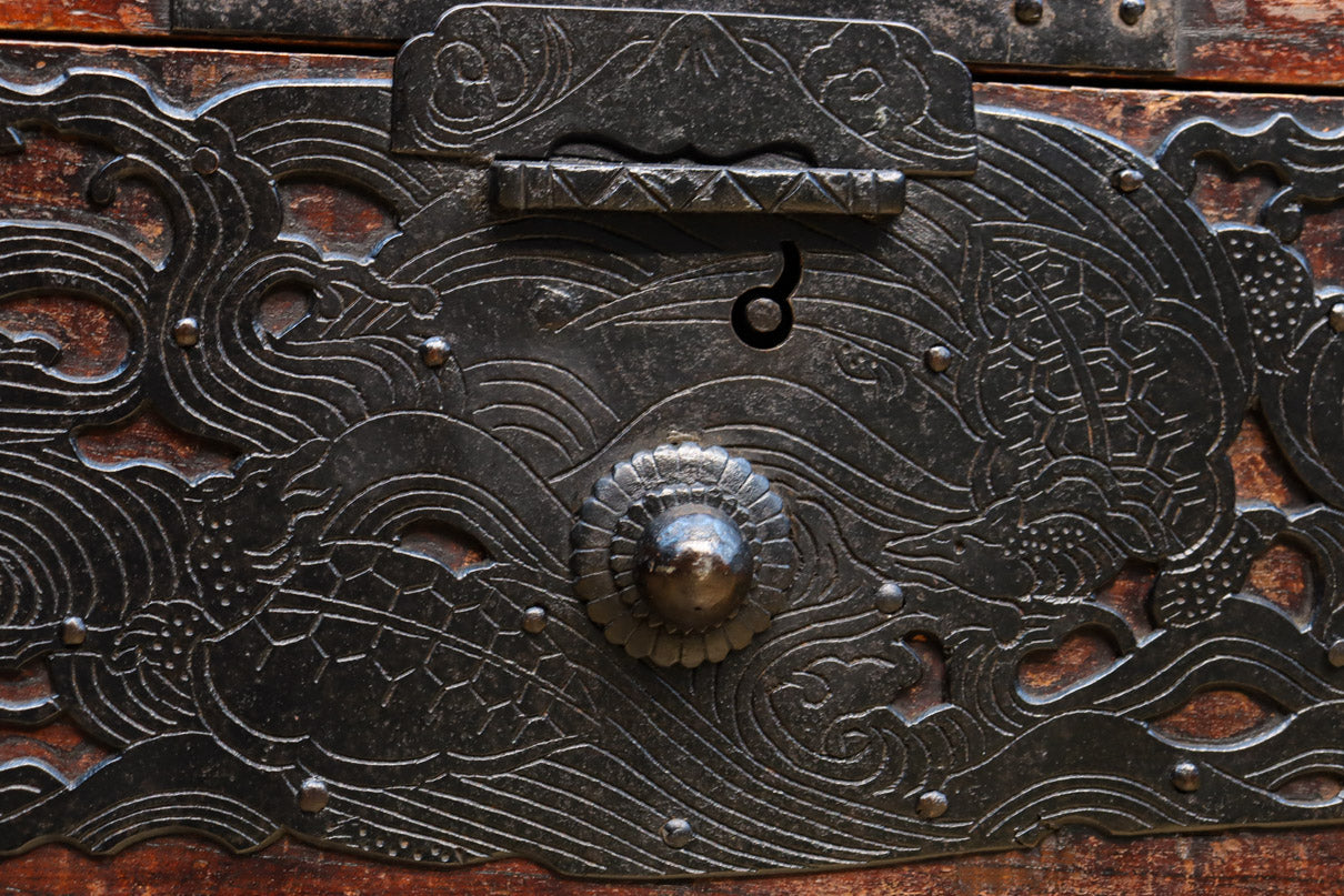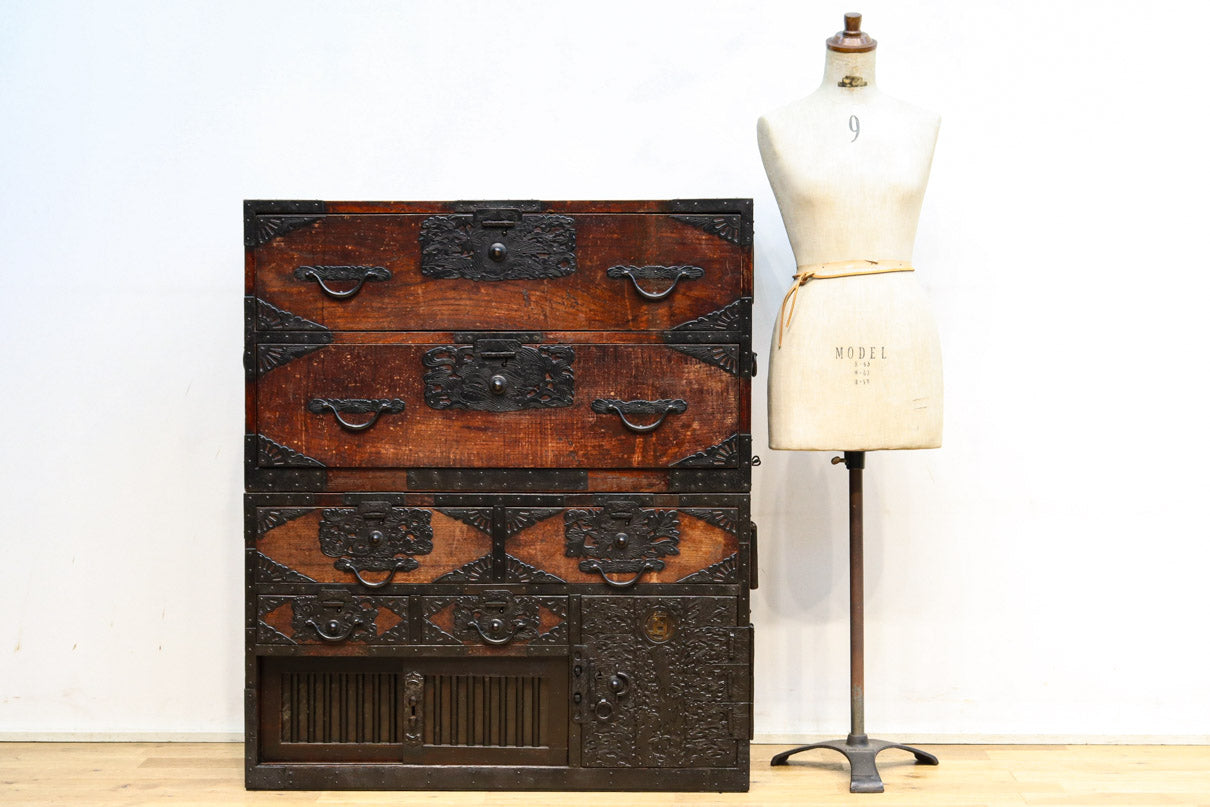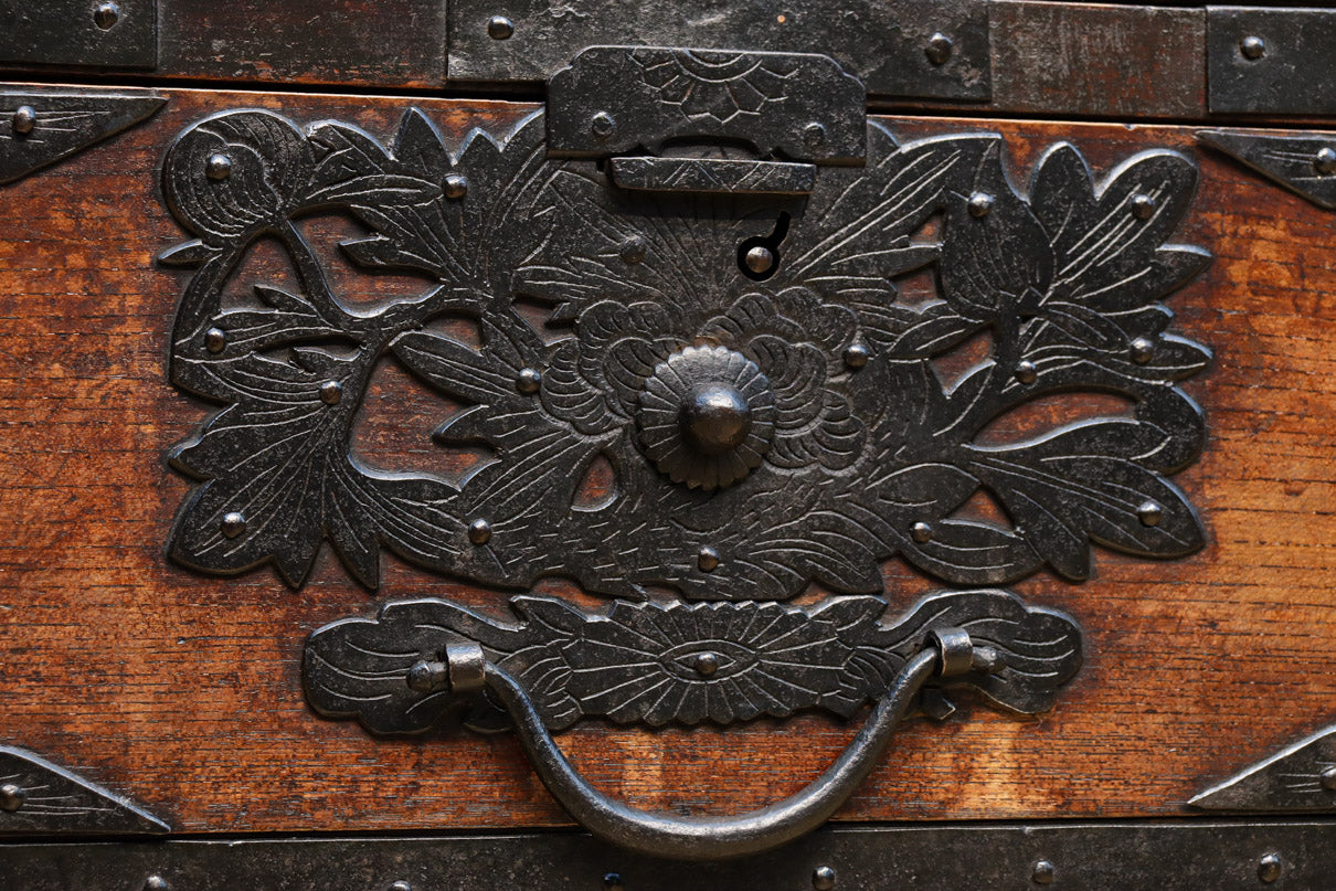 見事な装飾金具と小さな引き戸を備えたデザインが特徴的な箪笥ですので、