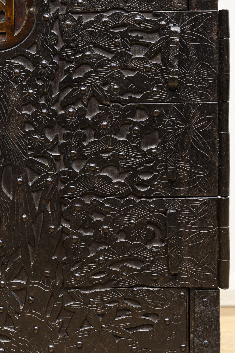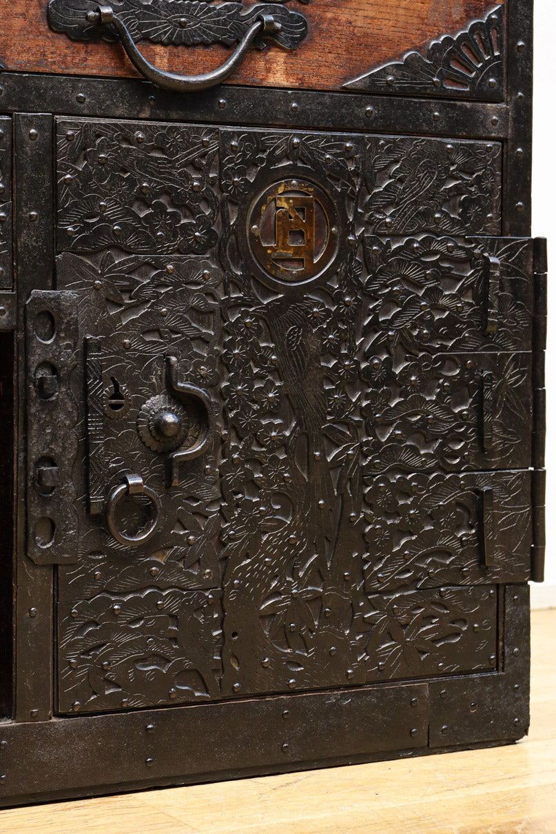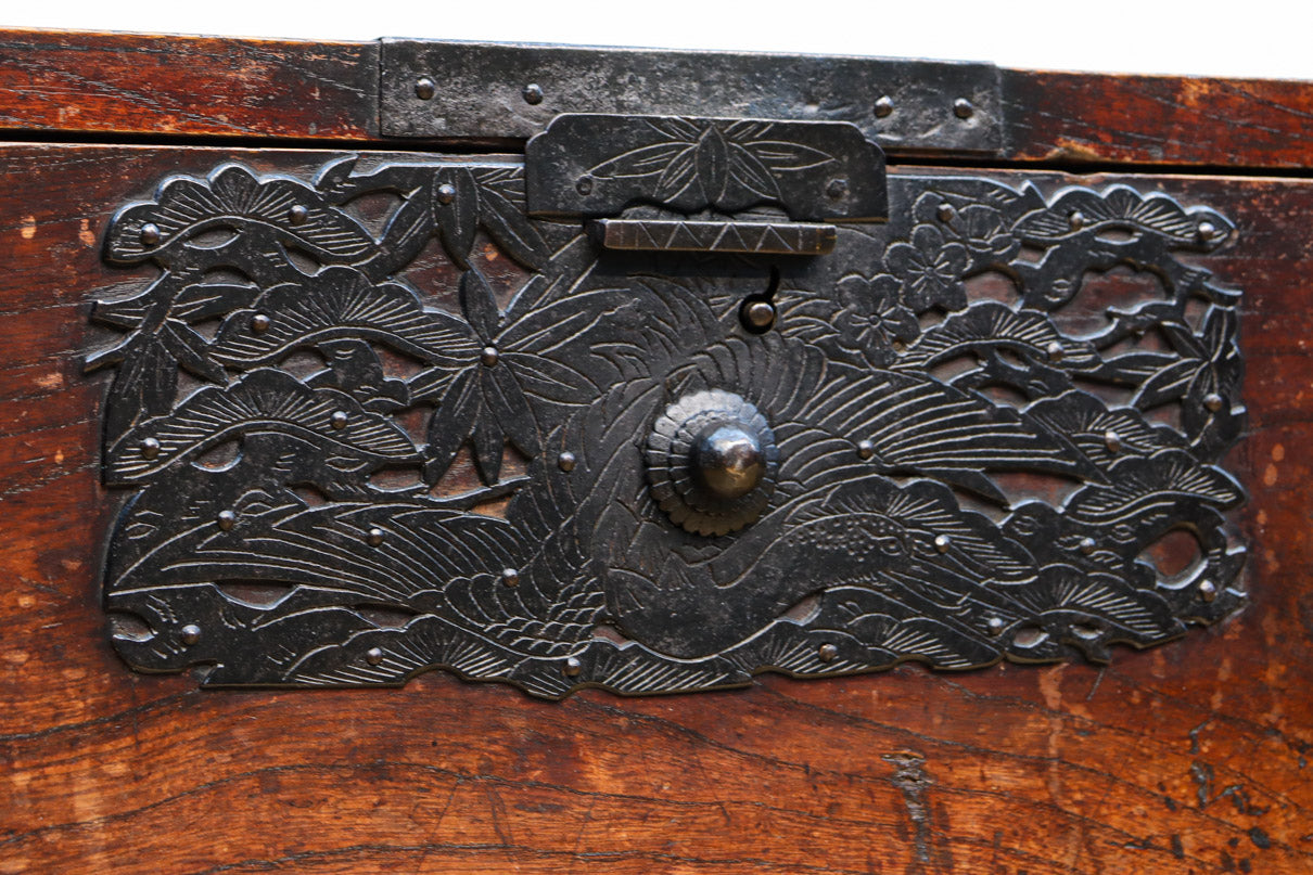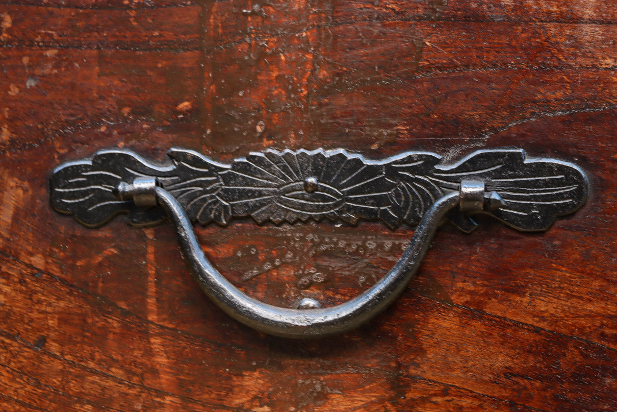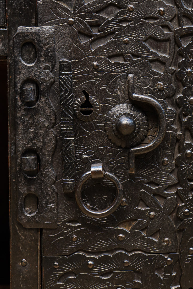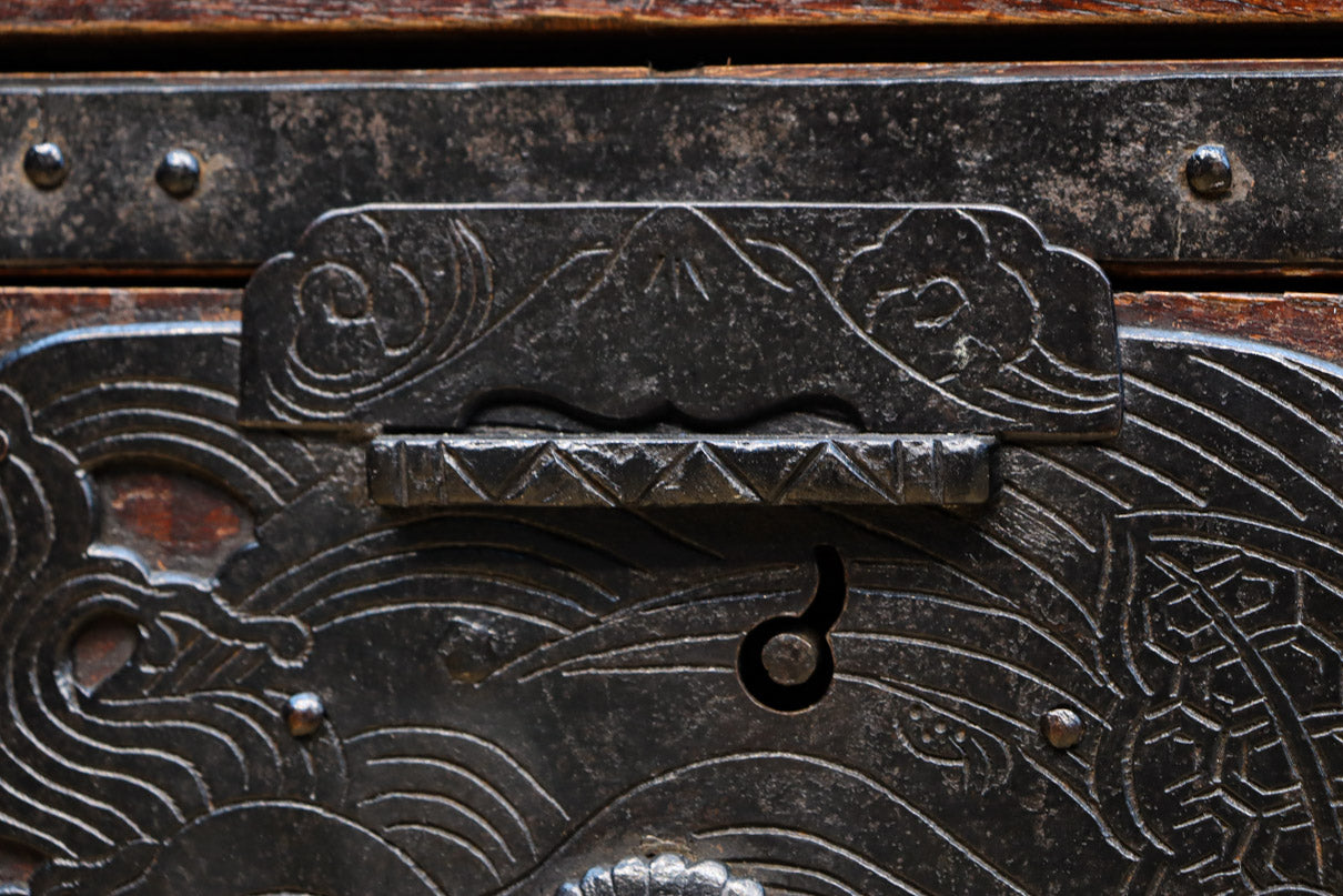 見事な装飾金具と小さな引き戸を備えたデザインが特徴的な箪笥ですので、