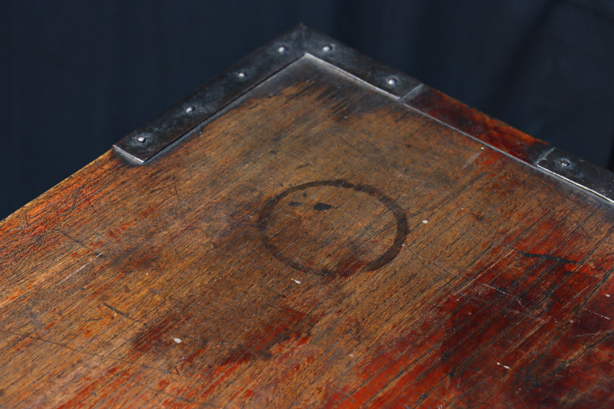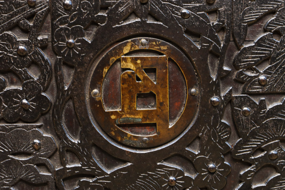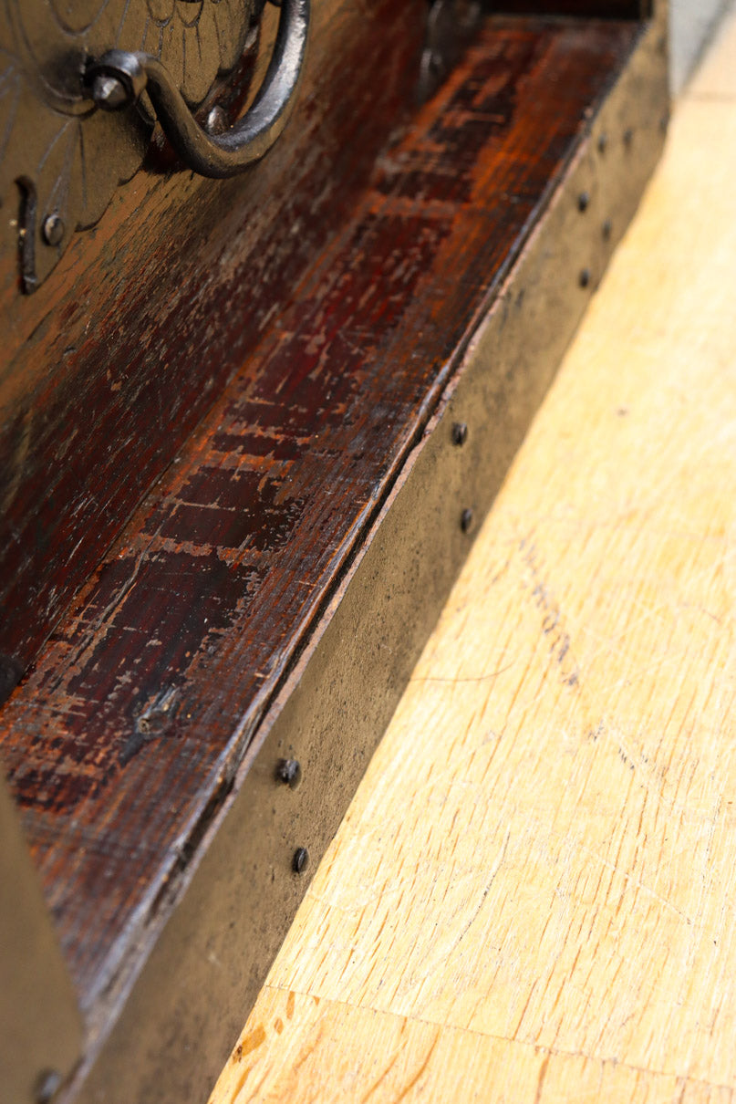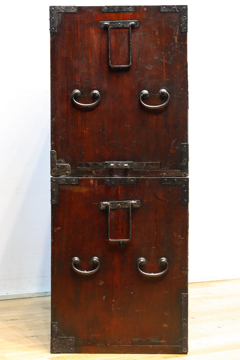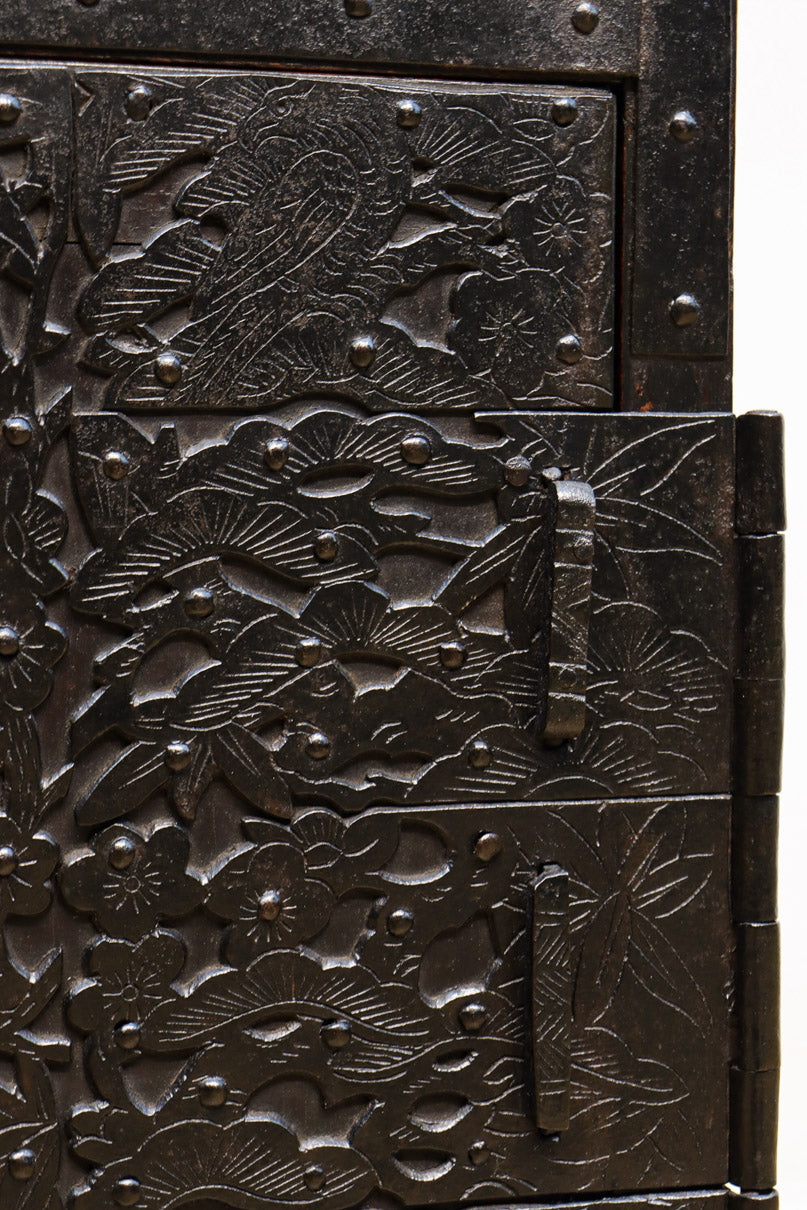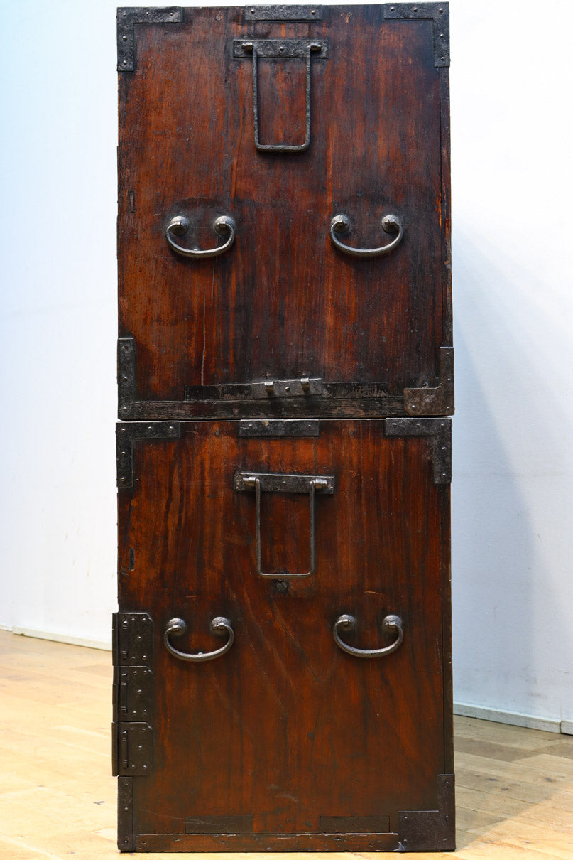 見事な装飾金具と小さな引き戸を備えたデザインが特徴的な箪笥ですので、