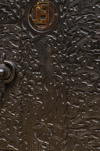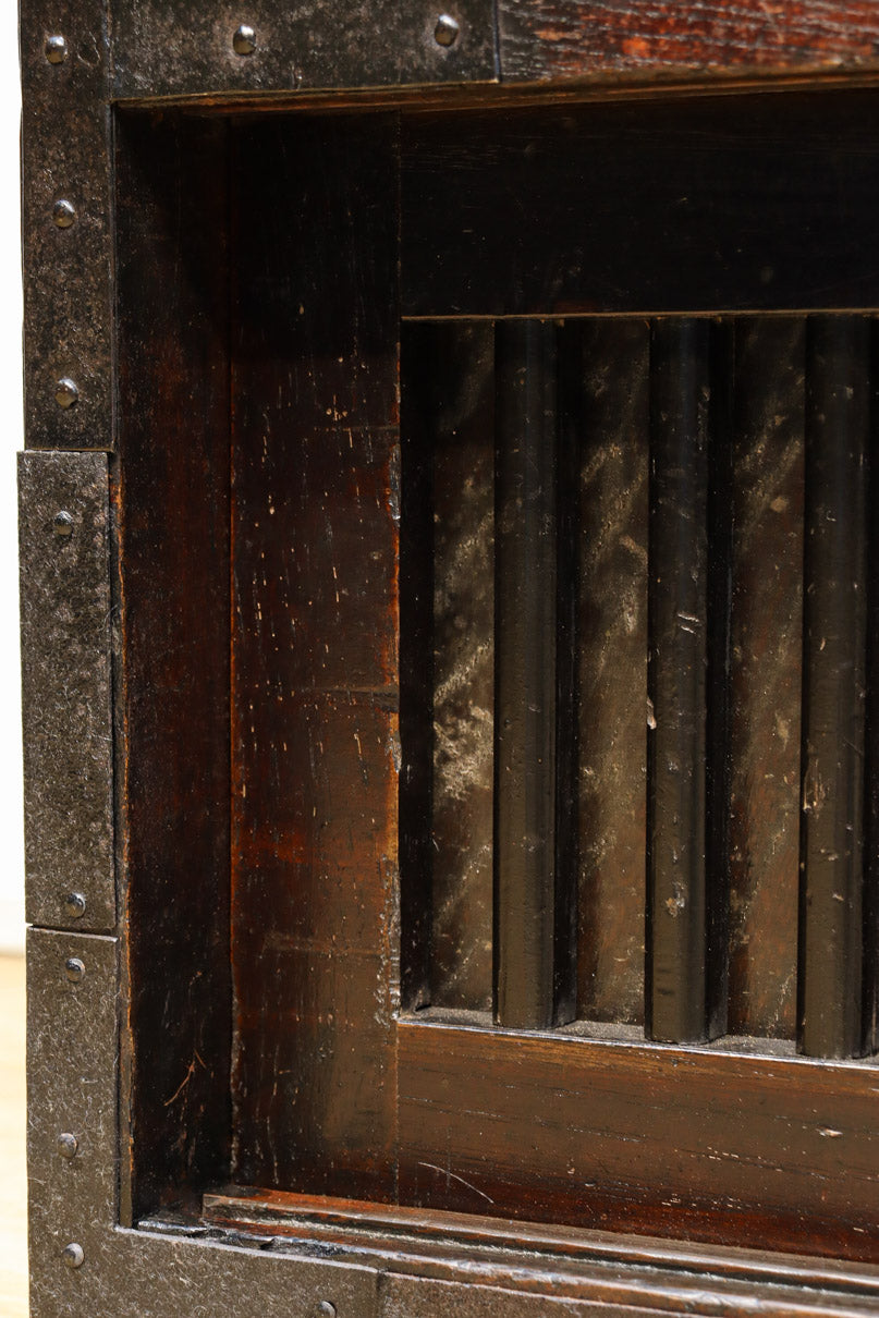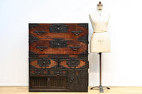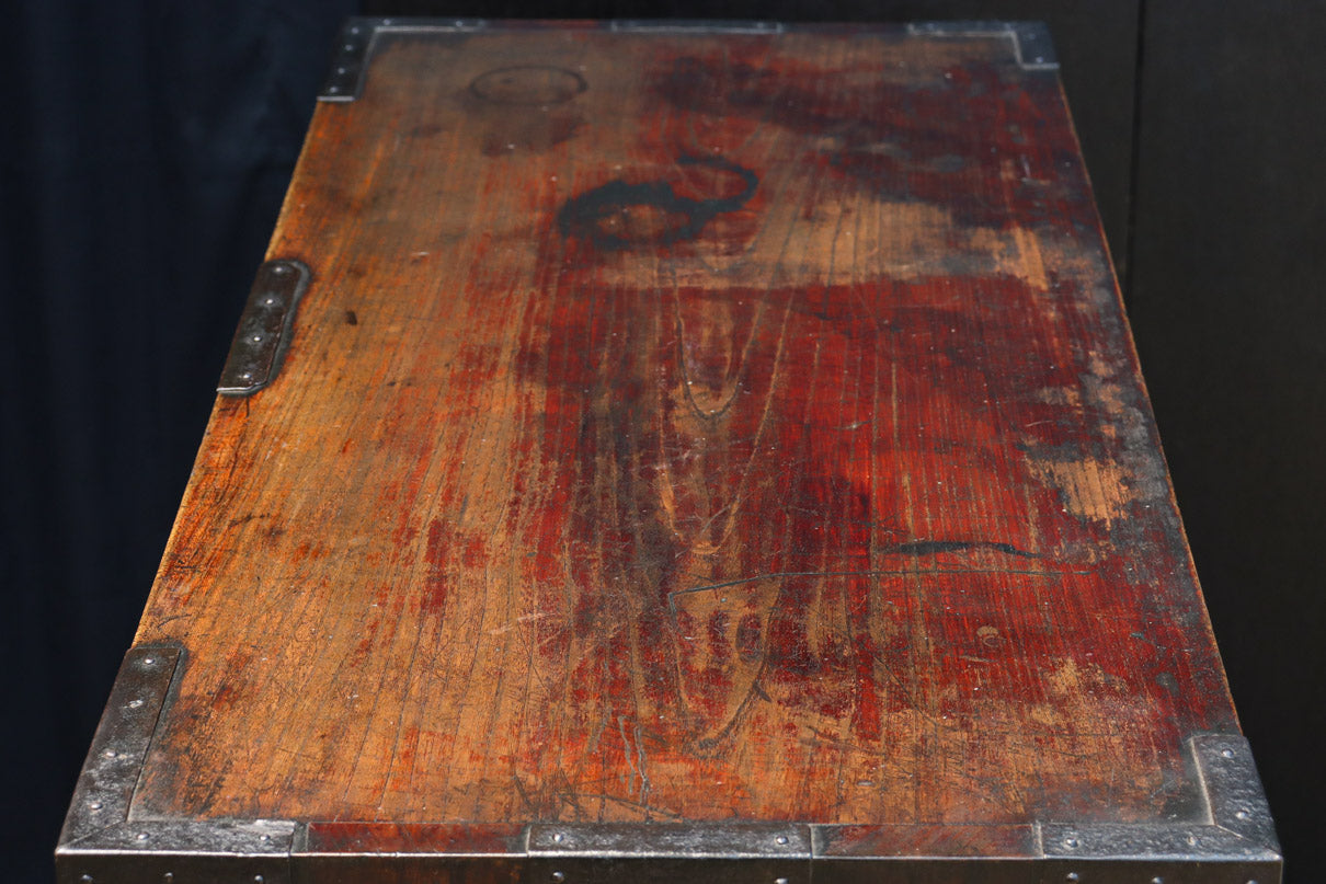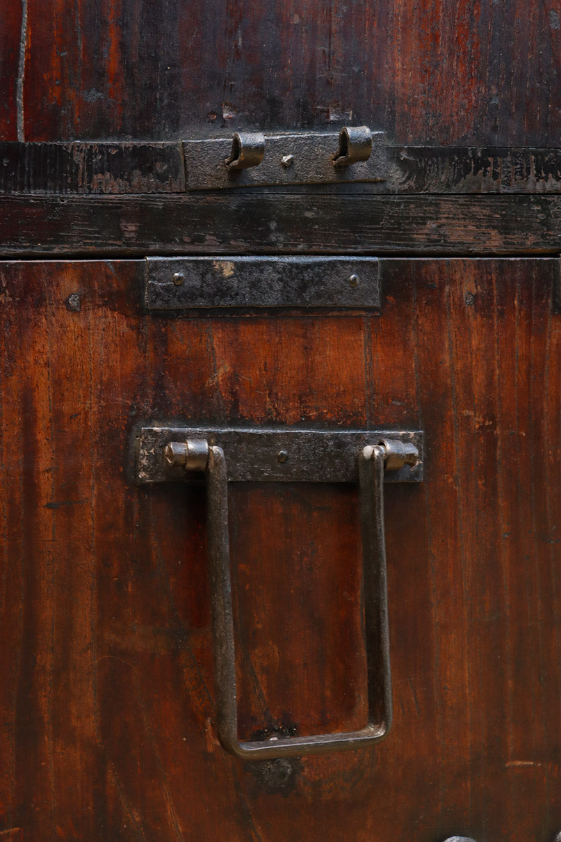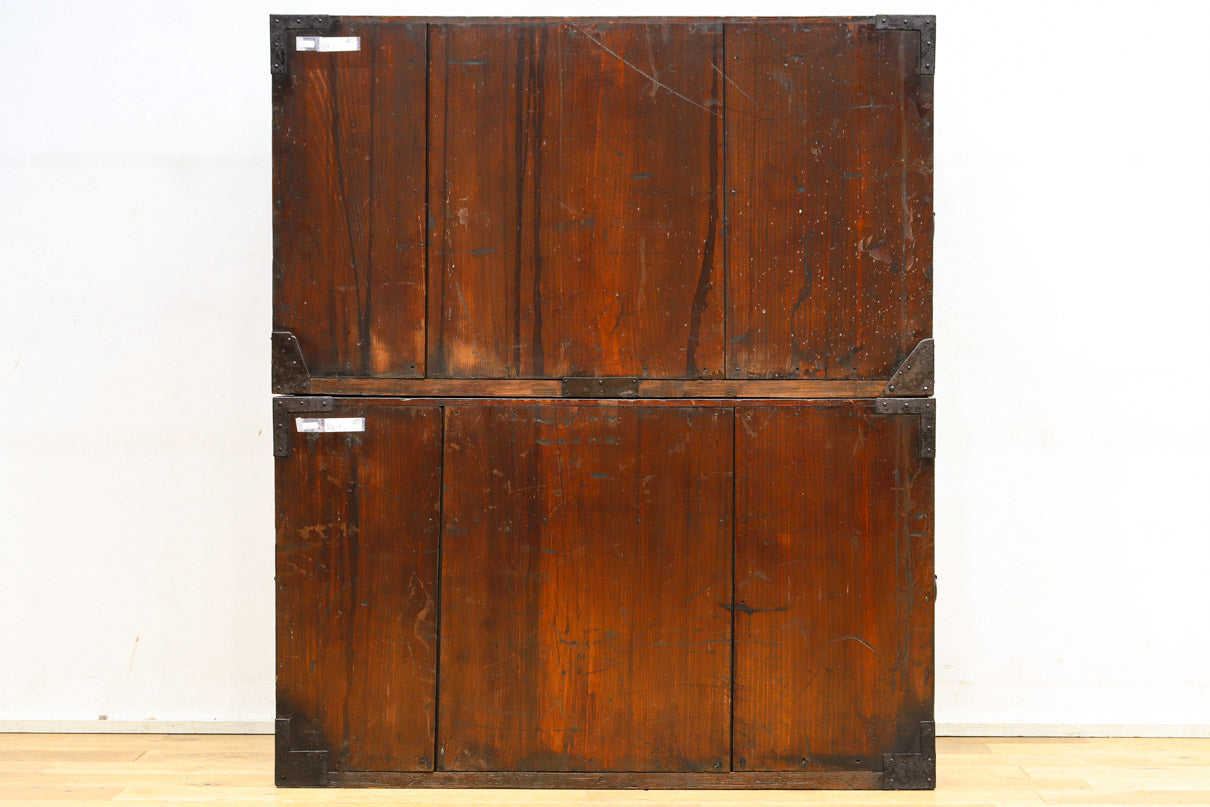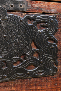 変わりデザイン!! 渋みある古色に絢爛な装飾金具で時代の貫禄漂う佐渡帳場箪笥 BB2939