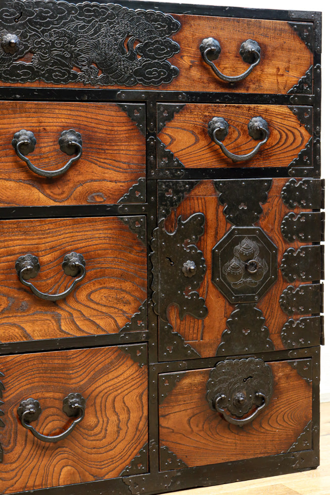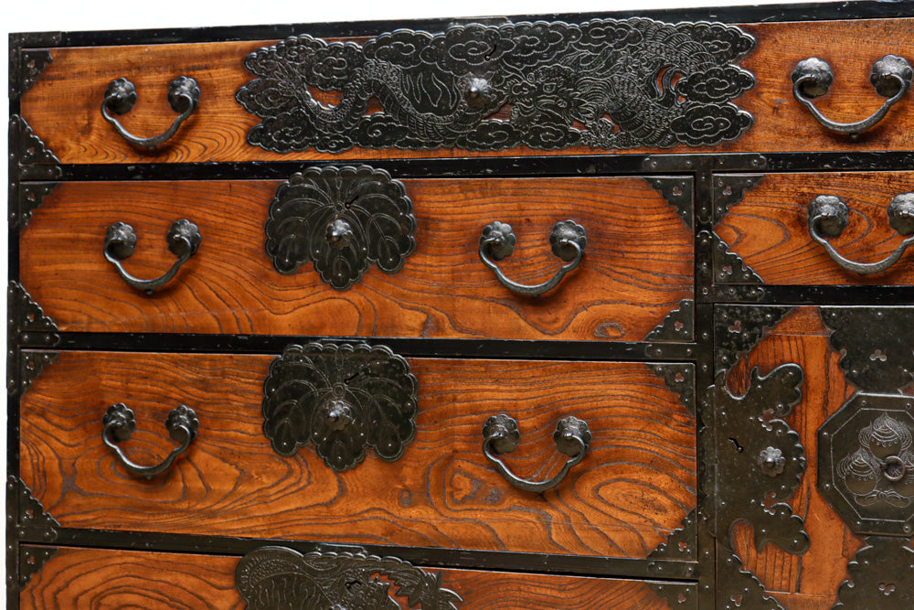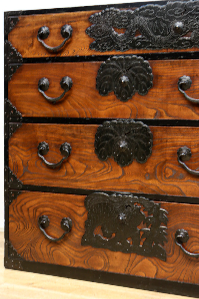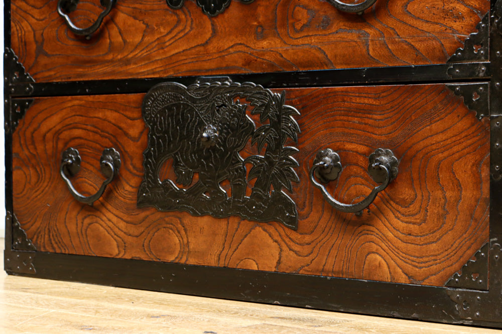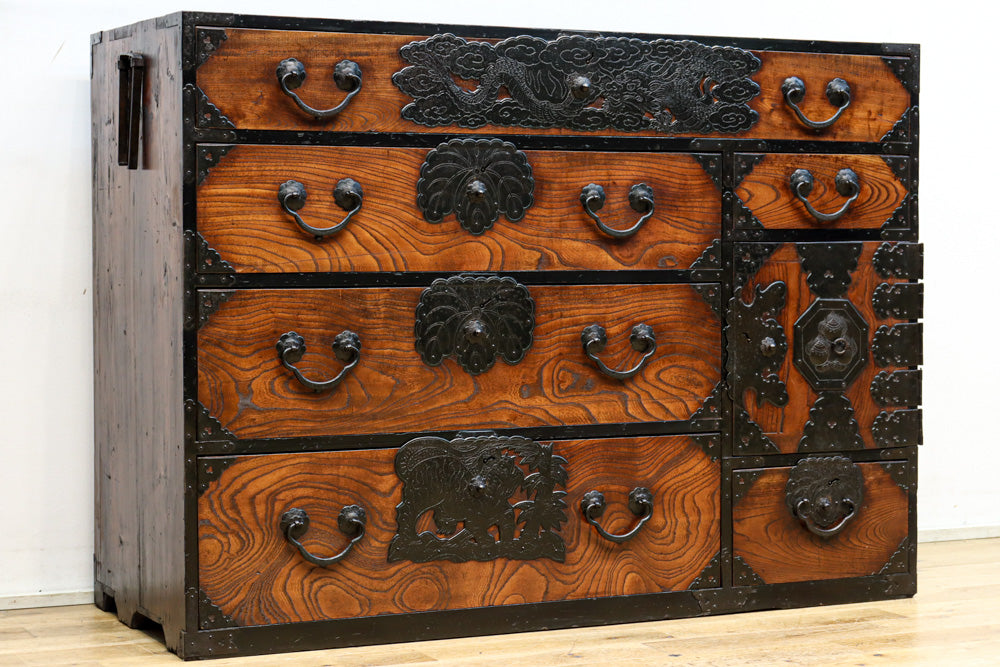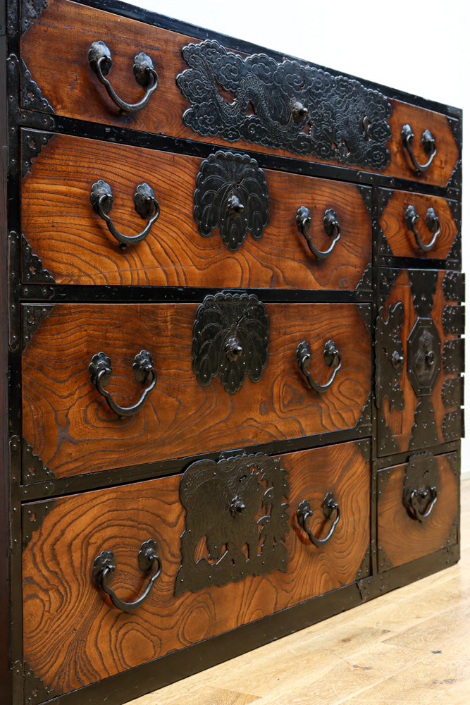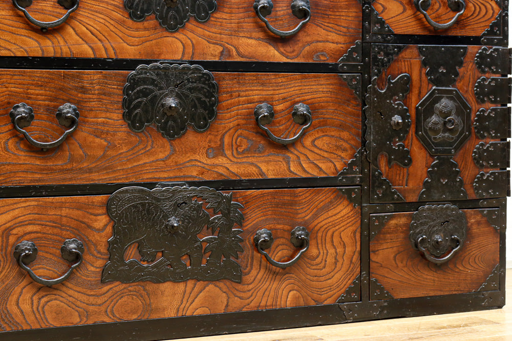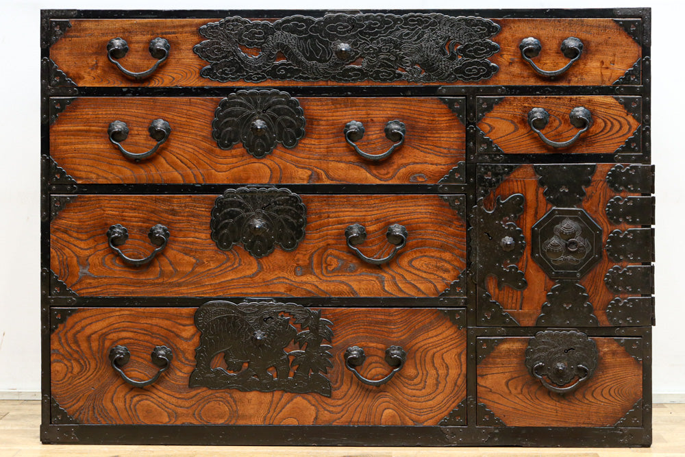極上!! 華やかな欅杢目に龍虎金具が映える仙台衣裳箪笥 BB3062