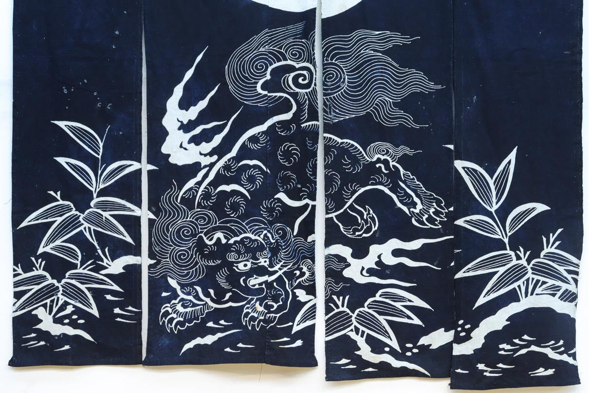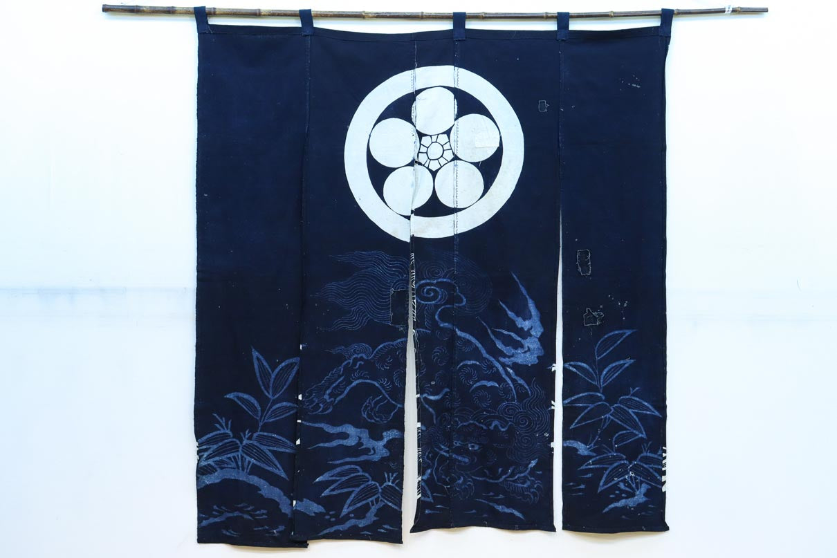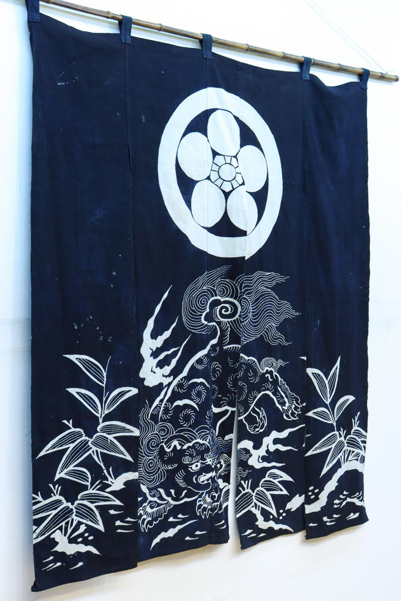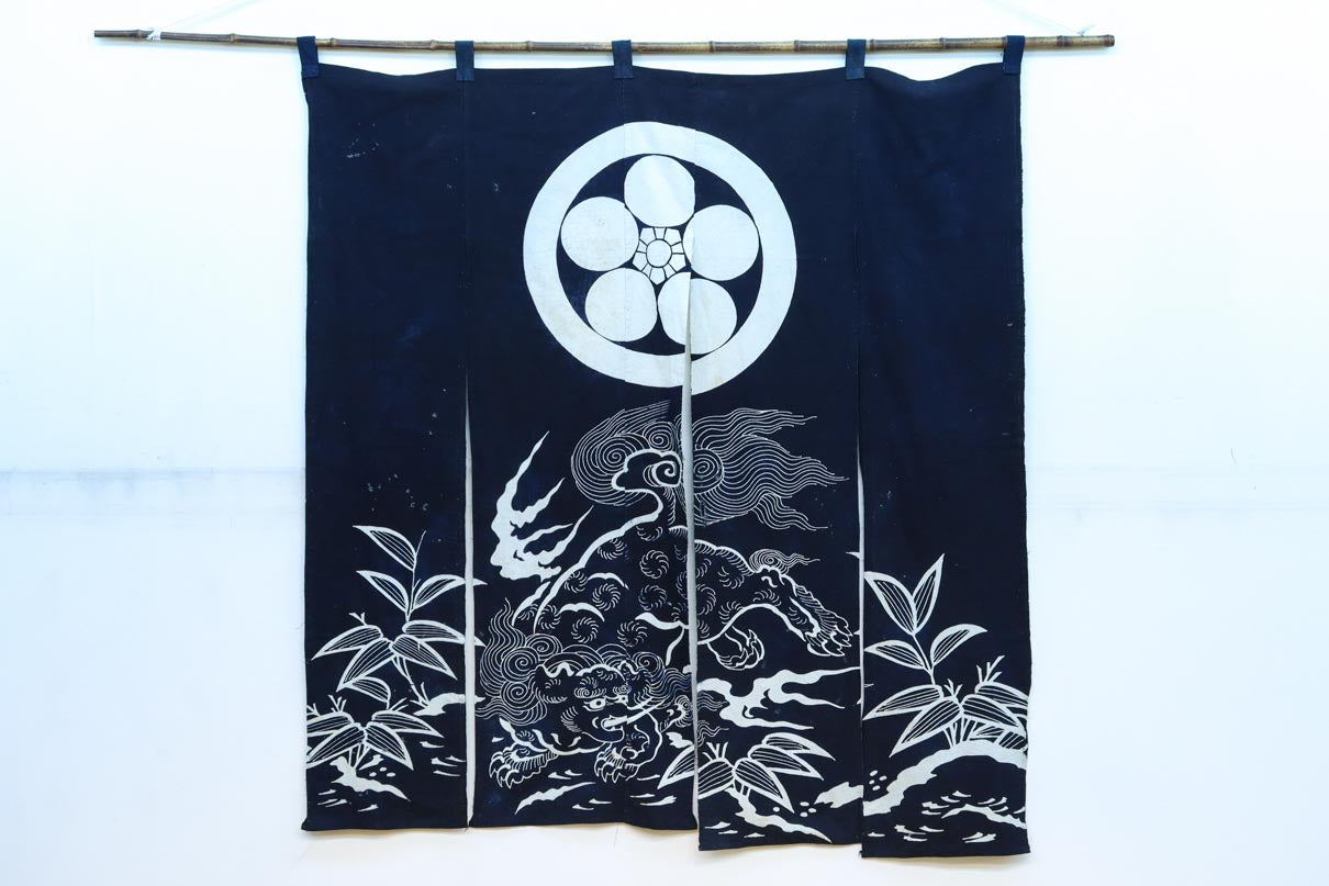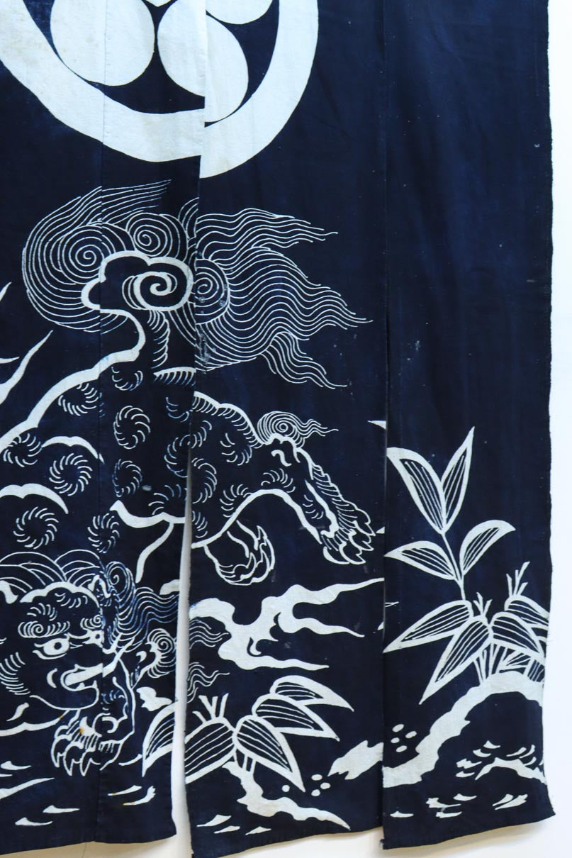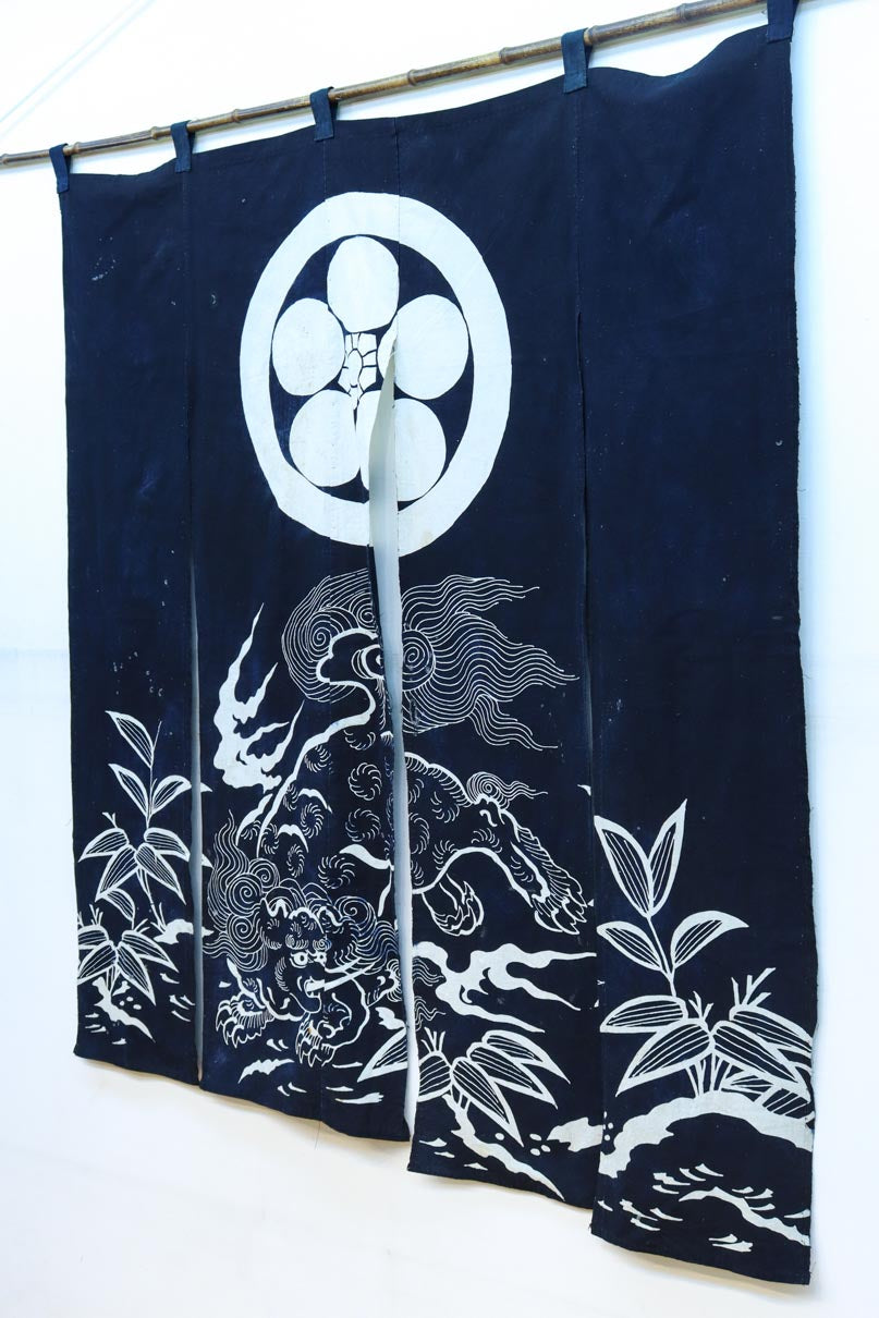 貫録のある唐獅子と丸に梅鉢紋で和の面持ちある暖簾 DC7770