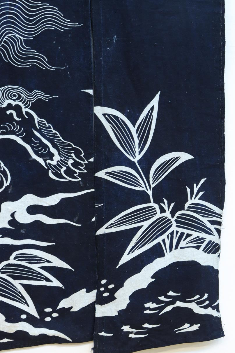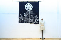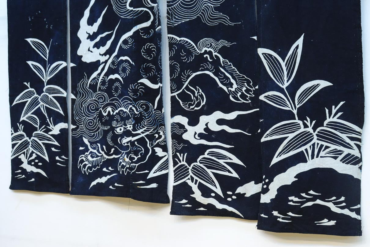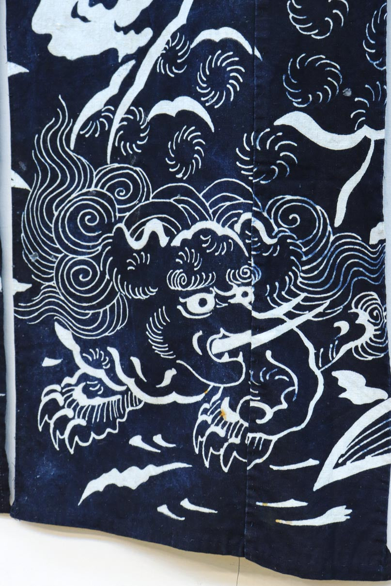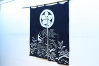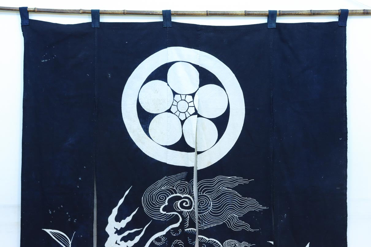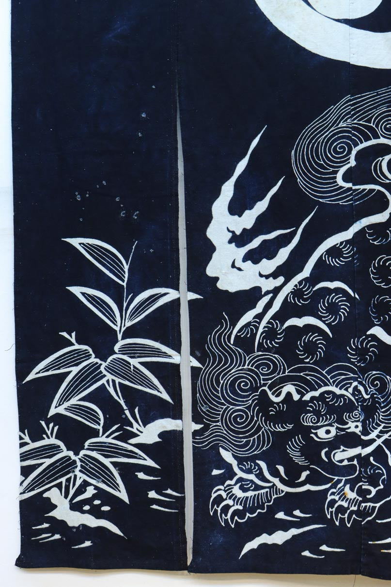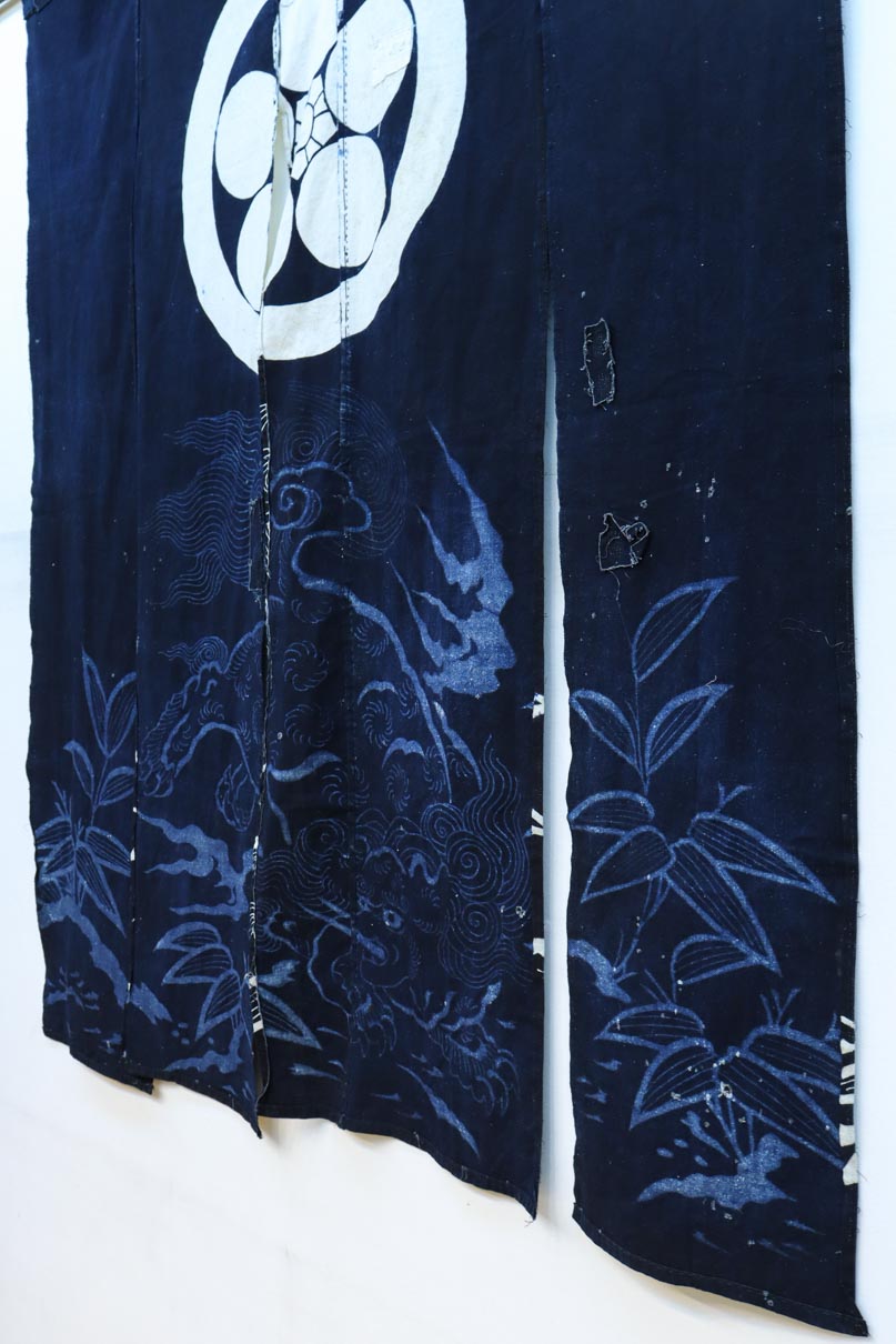 貫録のある唐獅子と丸に梅鉢紋で和の面持ちある暖簾 DC7770